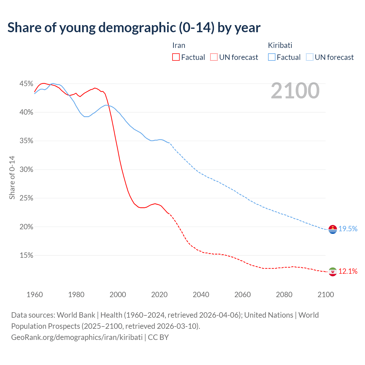 - The share of young demographic (0-15 years old) in Iran is 22.4% vs 34.7% in Kiribati.