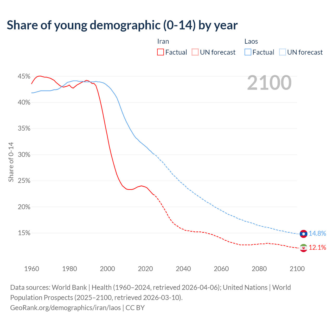 - As of 2026, the population of Iran is 93.5M vs 8M in Laos - 11.7 times difference.
