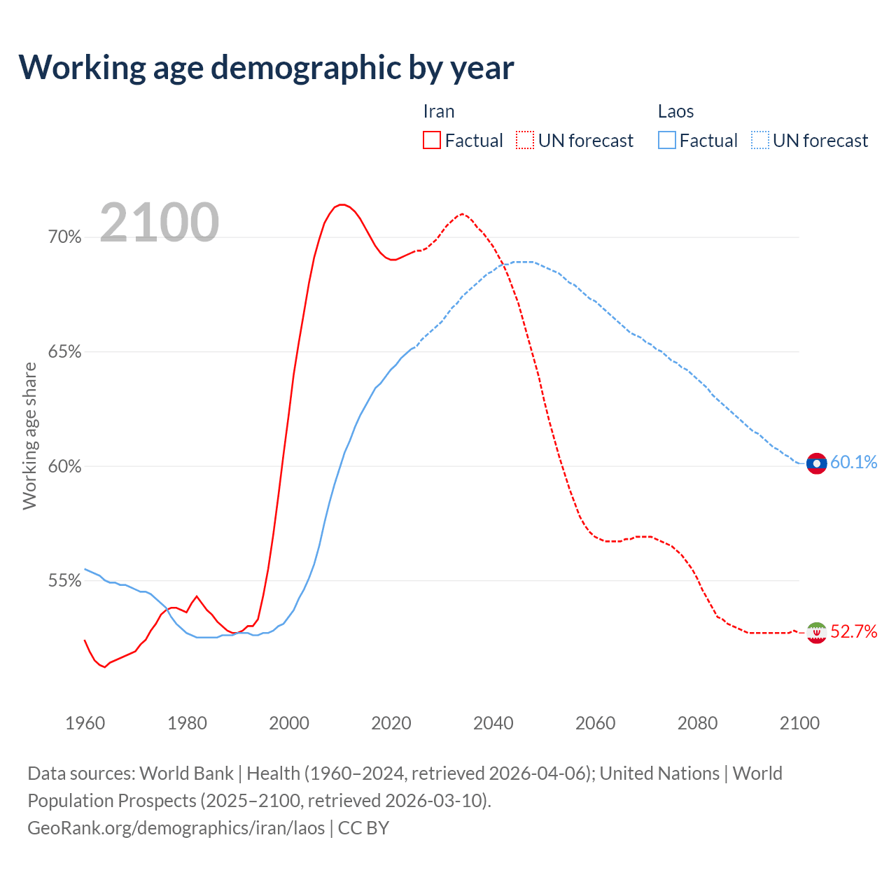 - Iran has 64.8M working age adults (aged 15-64) vs 5.21M in Laos.