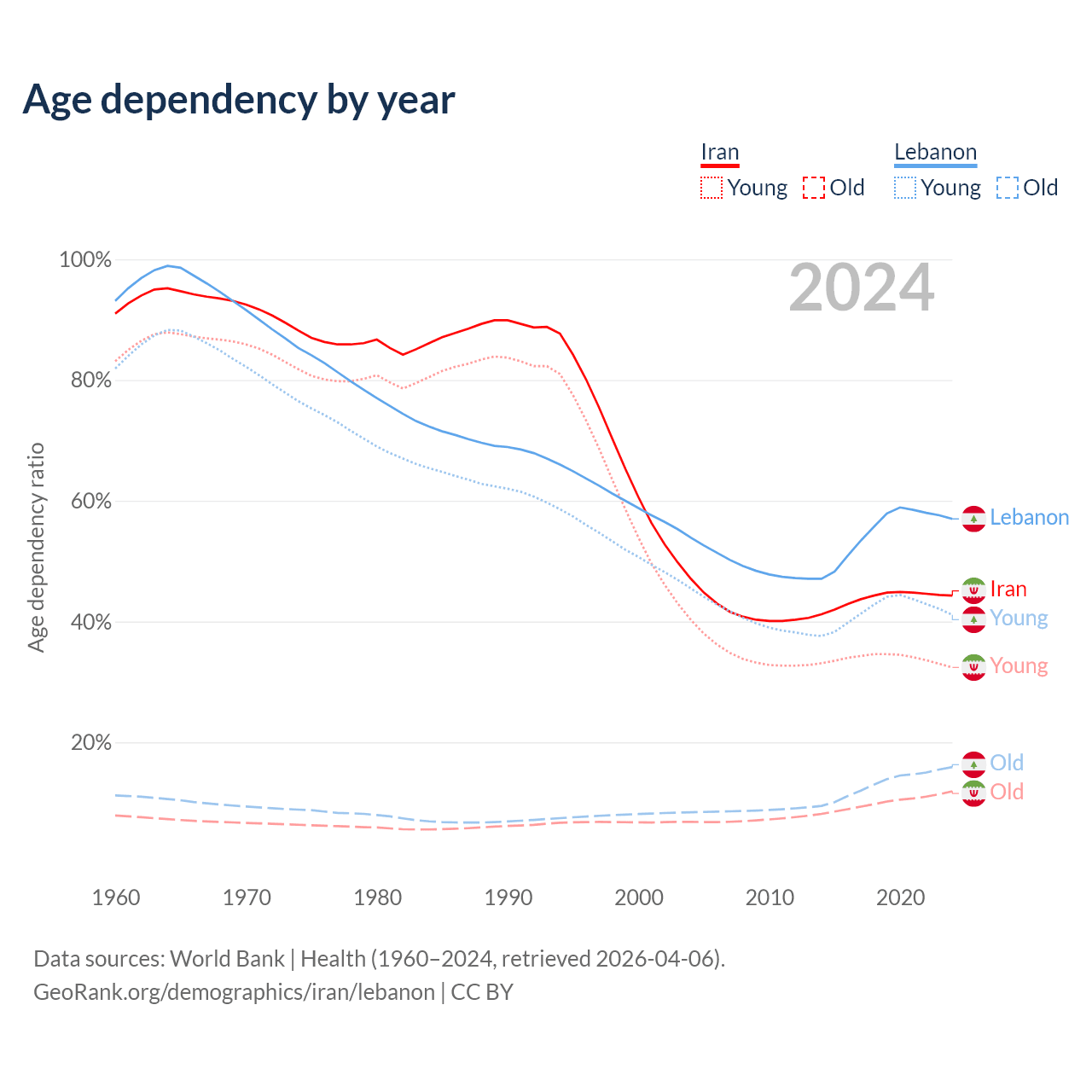 - Iran is ranked 79/196 by median age (oldest to youngest) vs 106/196 for Lebanon.