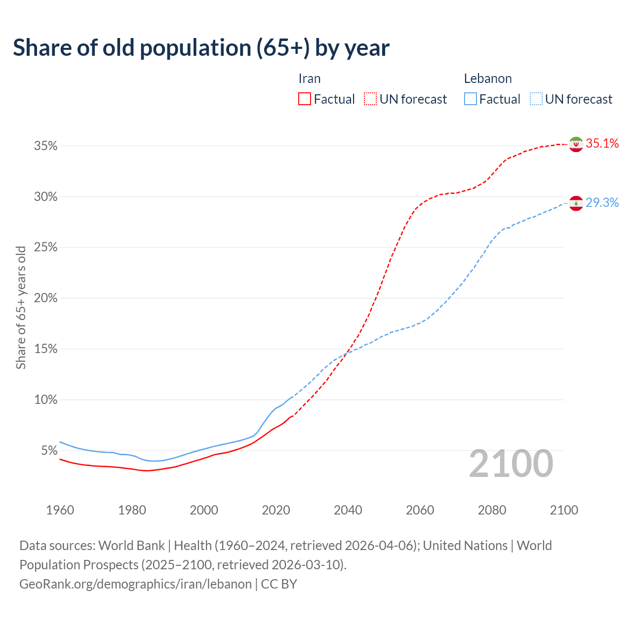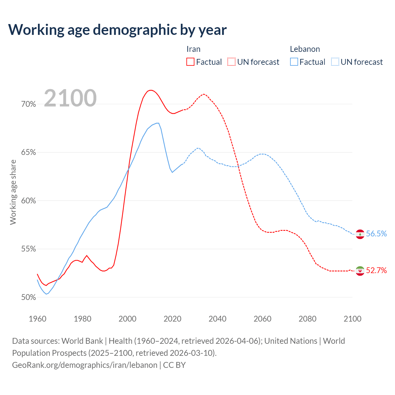 Median age Iran vs Lebanon, 1960-2100