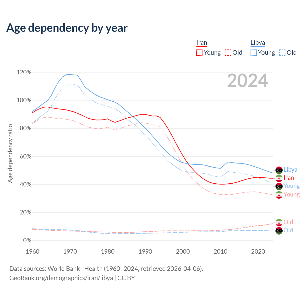 The share of older people aged 65 and over is 8.24% in Iran and 5.02% in Libya. Life expectancy in Iran compared to Libya .