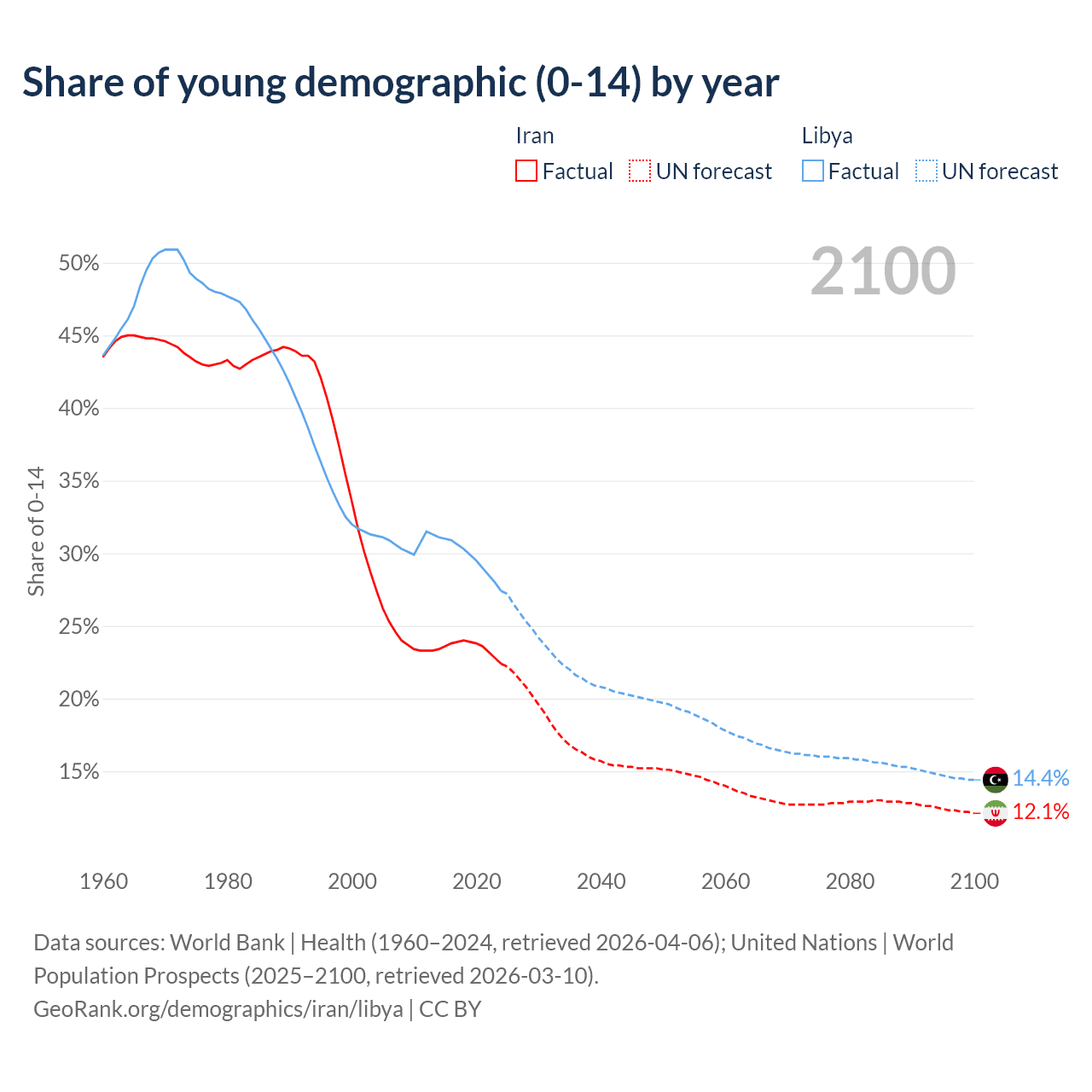 - The share of young demographic (0-15 years old) in Iran is 22.4% vs 27.4% in Libya.