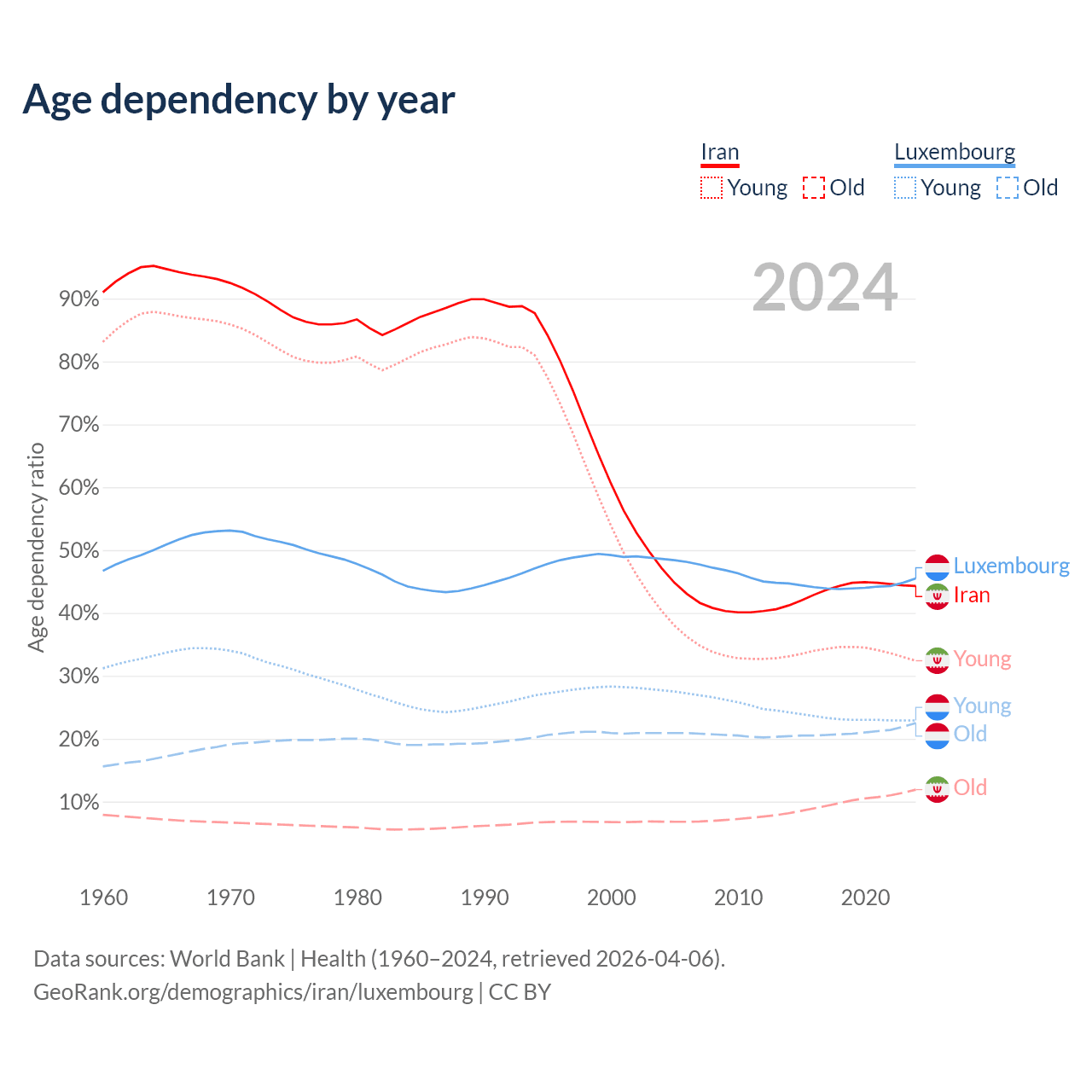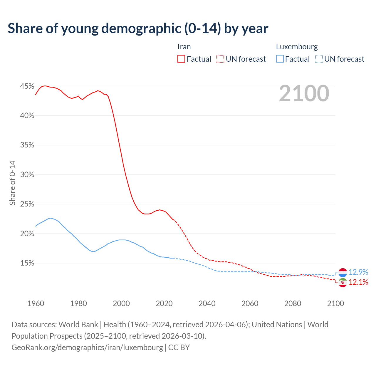 - The share of young demographic (0-15 years old) in Iran is 22.4% vs 15.8% in Luxembourg.