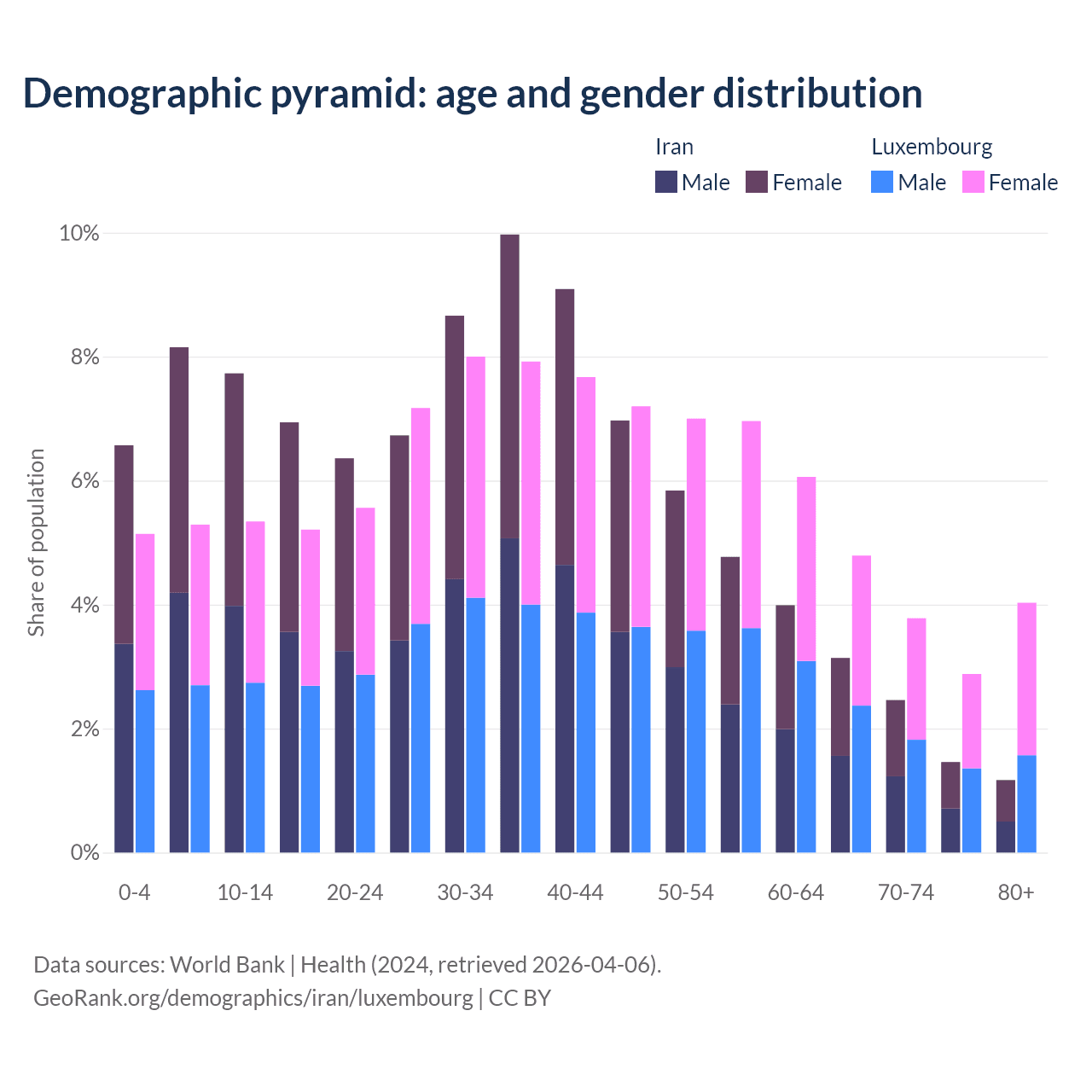 - Iran is ranked 79/196 by median age (oldest to youngest) vs 46/196 for Luxembourg.