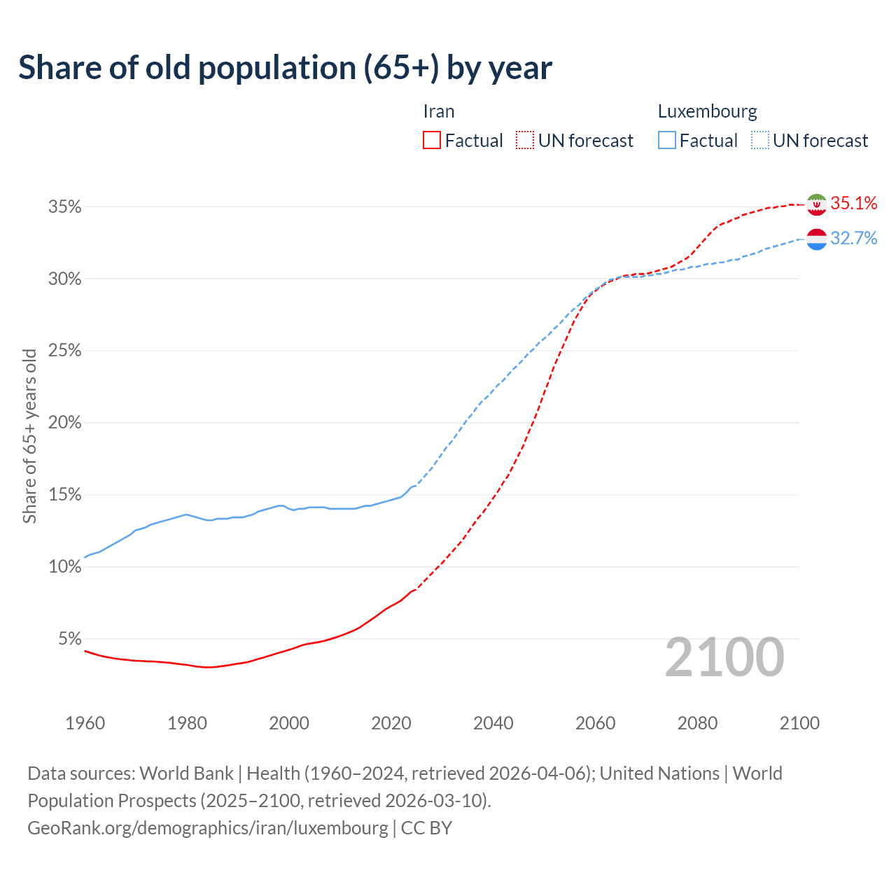 - The share of old-age demographic (65+) in Iran is 8.24% vs 15.5% in Luxembourg.