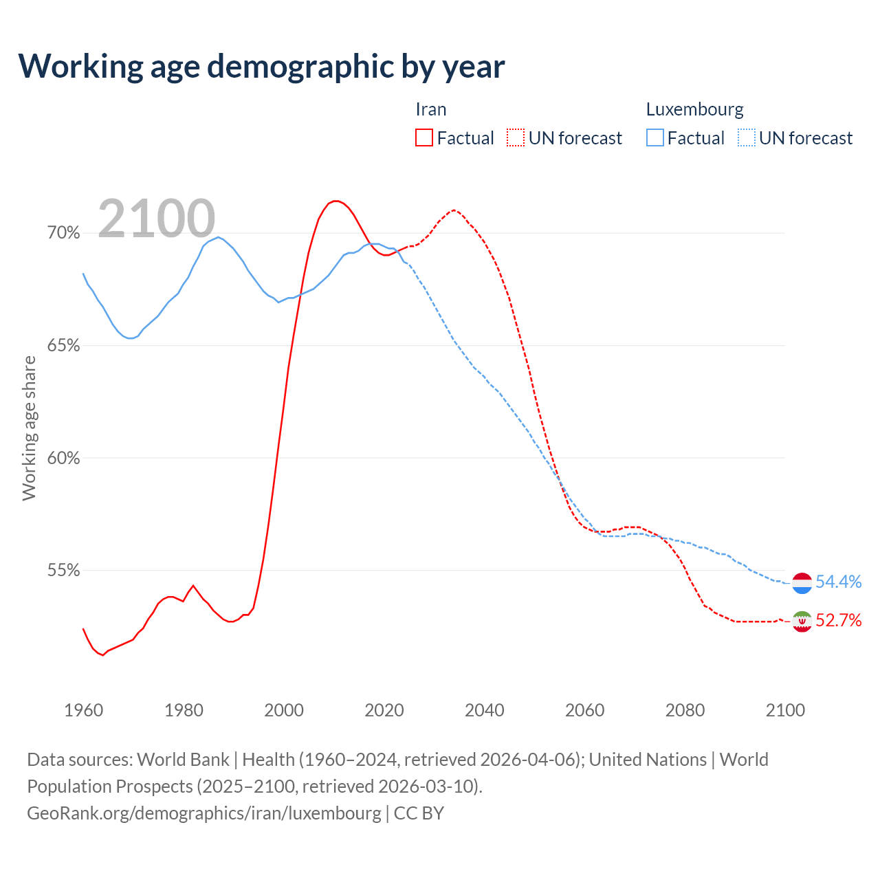 - Iran has 64.8M working age adults (aged 15-64) vs 477K in Luxembourg.