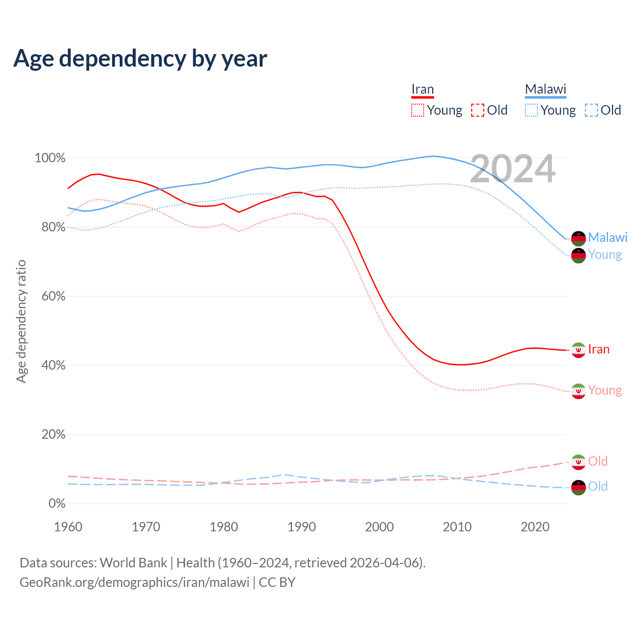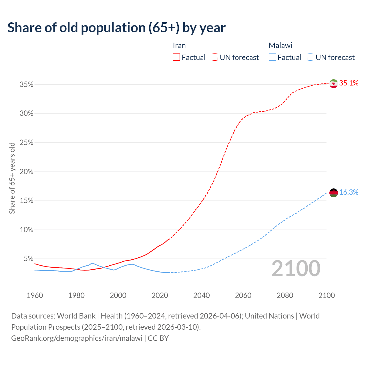 - The share of old-age demographic (65+) in Iran is 8.24% vs 2.59% in Malawi.