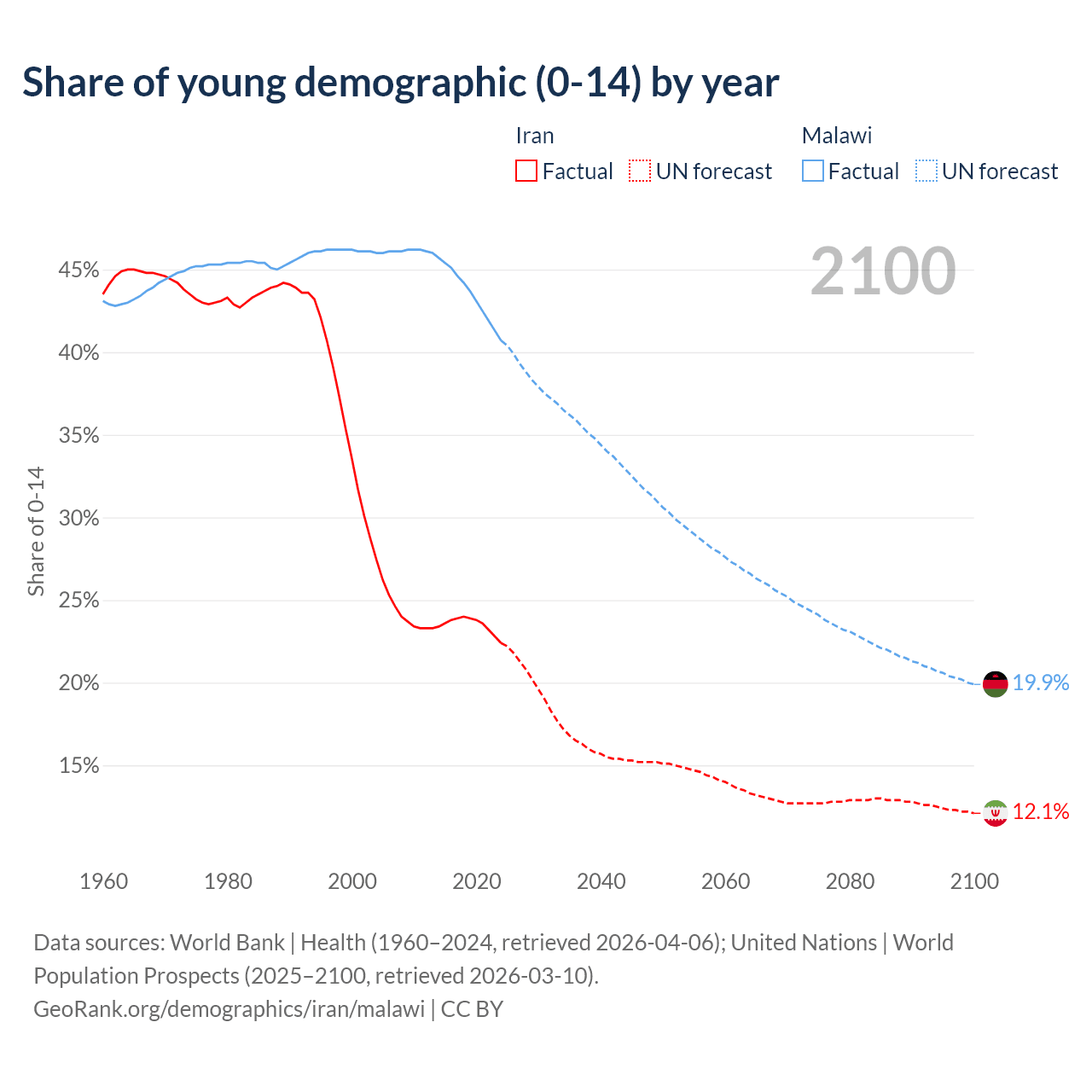 - The share of young demographic (0-15 years old) in Iran is 22.4% vs 40.7% in Malawi.