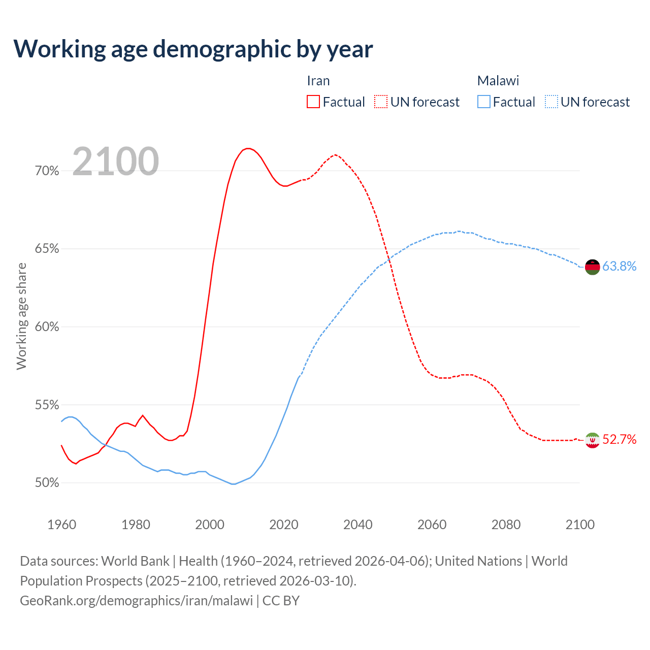 - Iran has 64.8M working age adults (aged 15-64) vs 13M in Malawi.