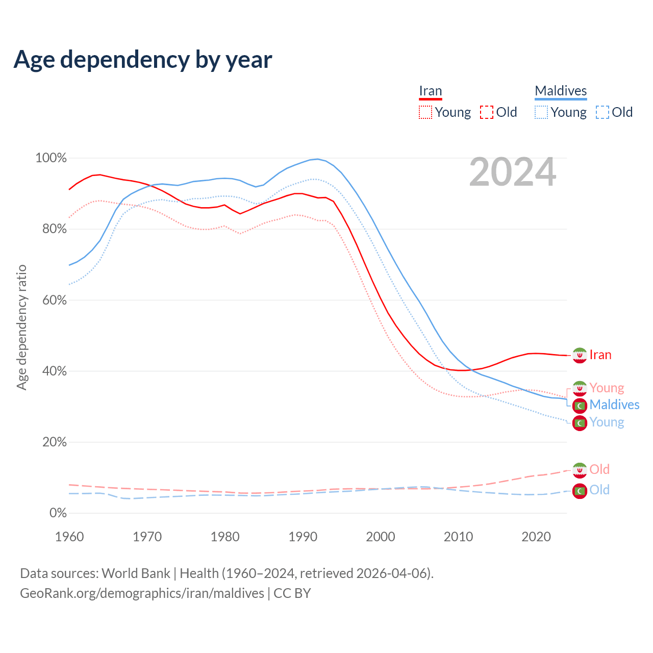 Data sources: World Bank | Health (1960–2024, retrieved 2026-04-06); U.S. Census Bureau (1960–2024, retrieved 2026-02-08).
