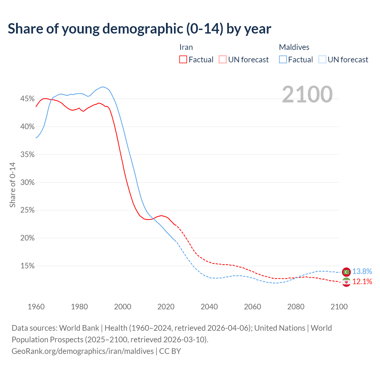 - The share of young demographic (0-15 years old) in Iran is 22.4% vs 19.6% in Maldives.