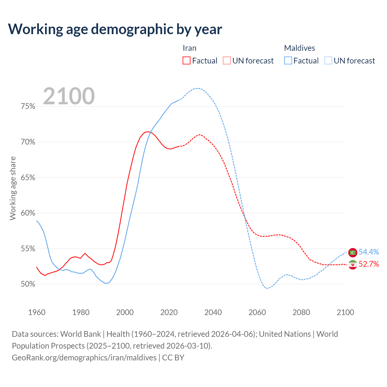 Median age Iran vs Maldives, 1960-2100