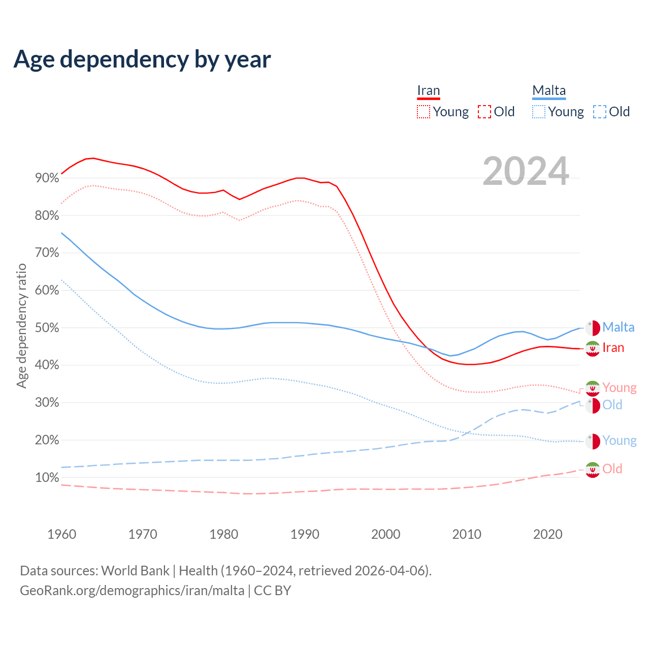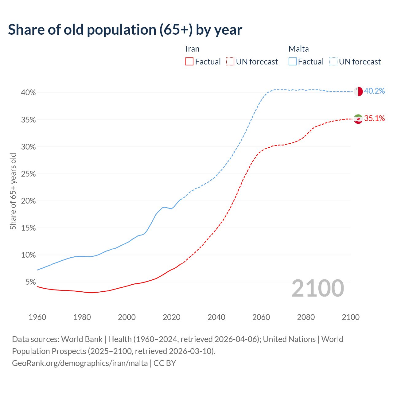 - The share of old-age demographic (65+) in Iran is 8.24% vs 20.2% in Malta.