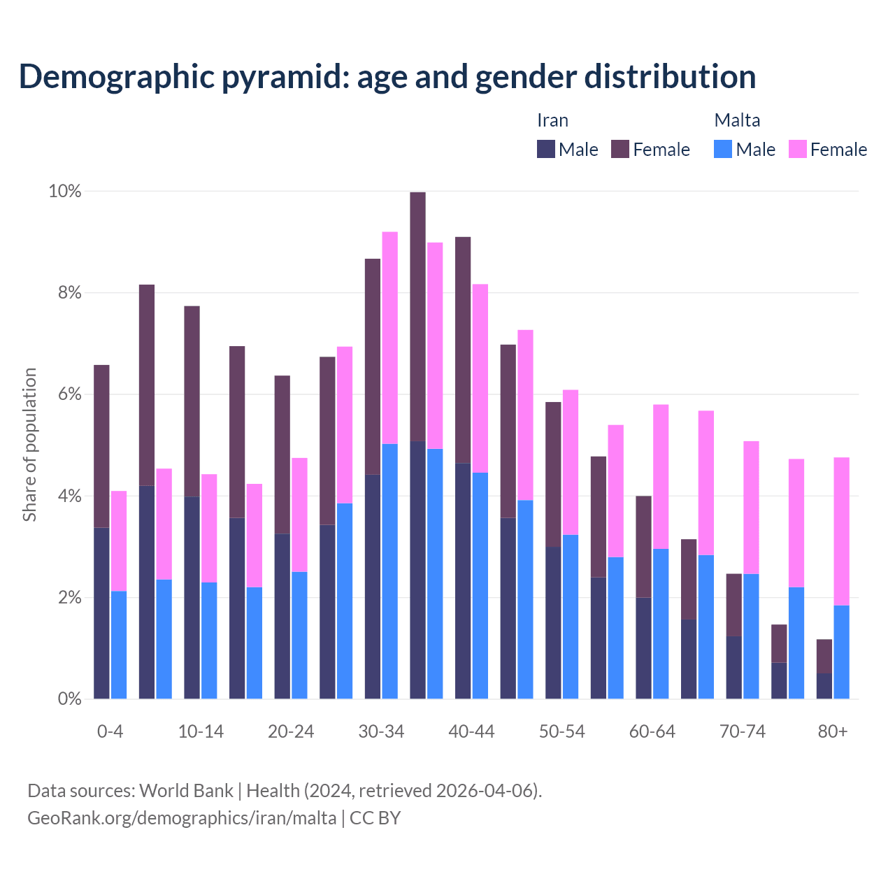 - As of 2026, the population of Iran is 93.5M vs 582K in Malta - 160.7 times difference.