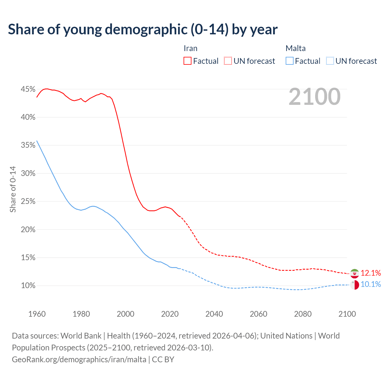 - The share of young demographic (0-15 years old) in Iran is 22.4% vs 13% in Malta.