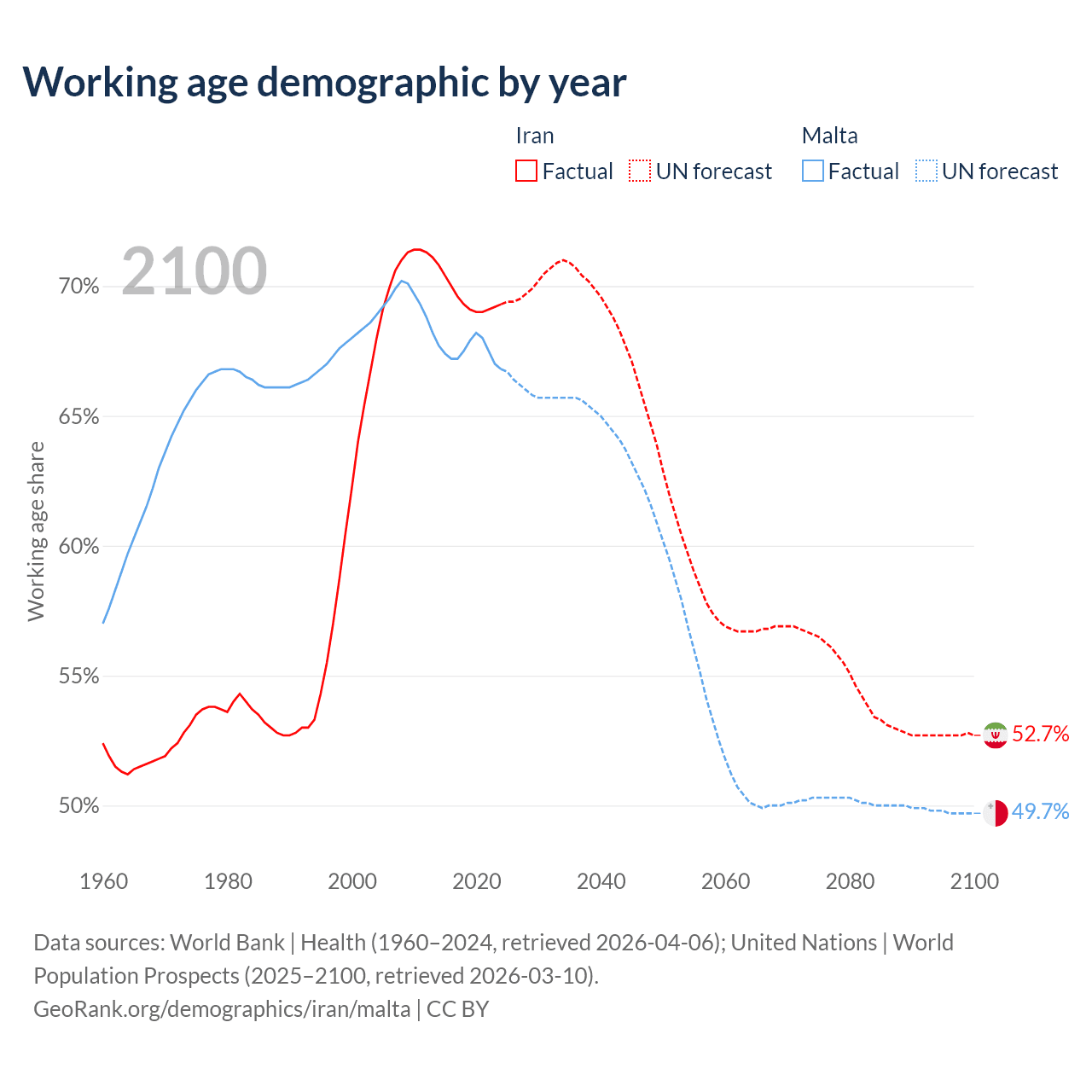- Iran has 64.8M working age adults (aged 15-64) vs 388K in Malta.