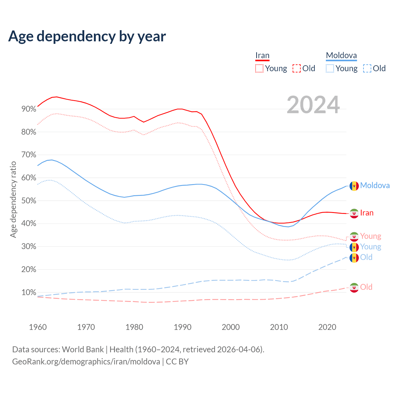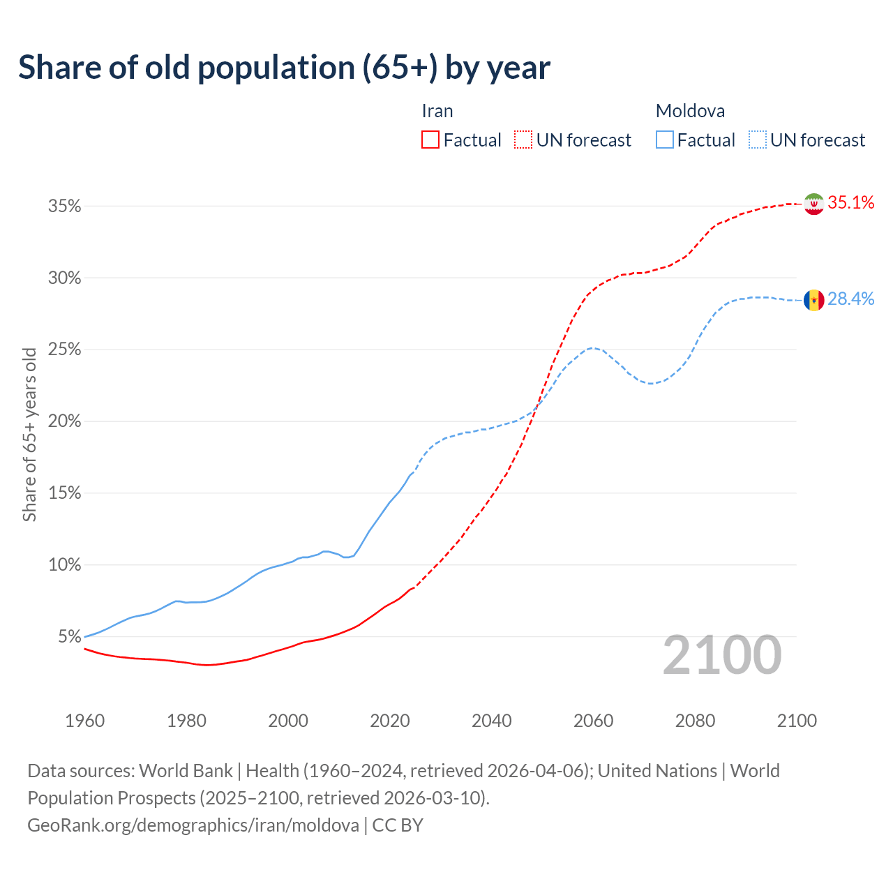 - The share of old-age demographic (65+) in Iran is 8.24% vs 16.2% in Moldova.
