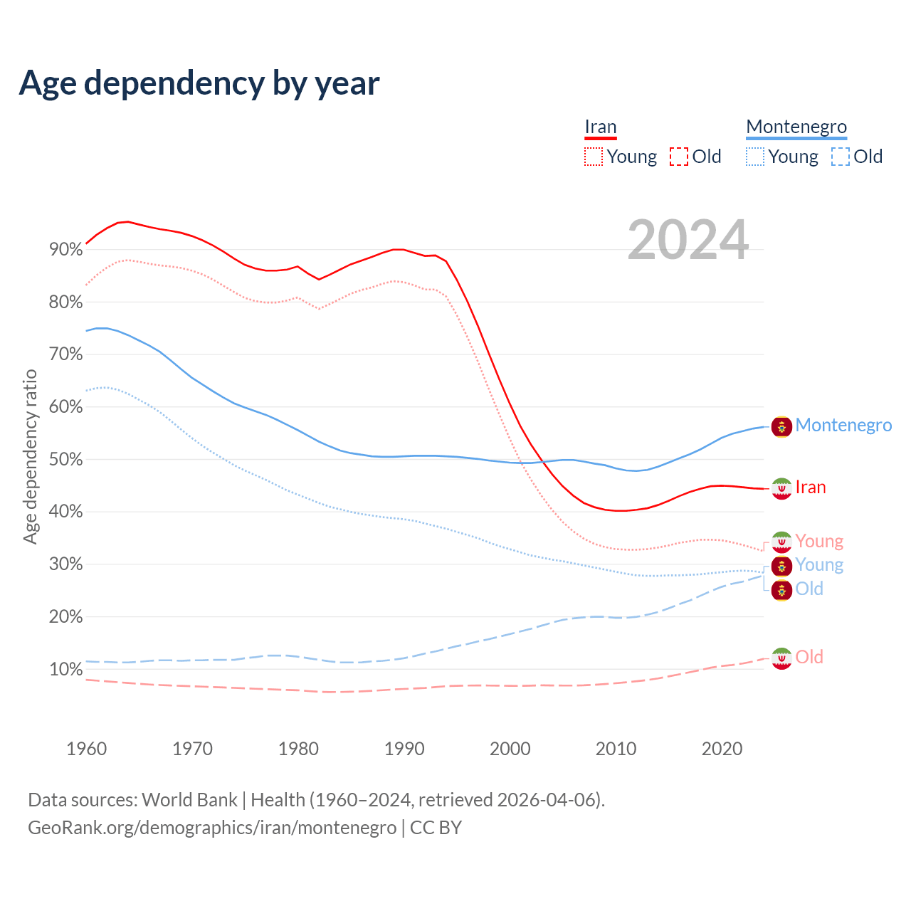 The share of older people aged 65 and over is 8.24% in Iran and 17.8% in Montenegro. Life expectancy in Iran compared to Montenegro .