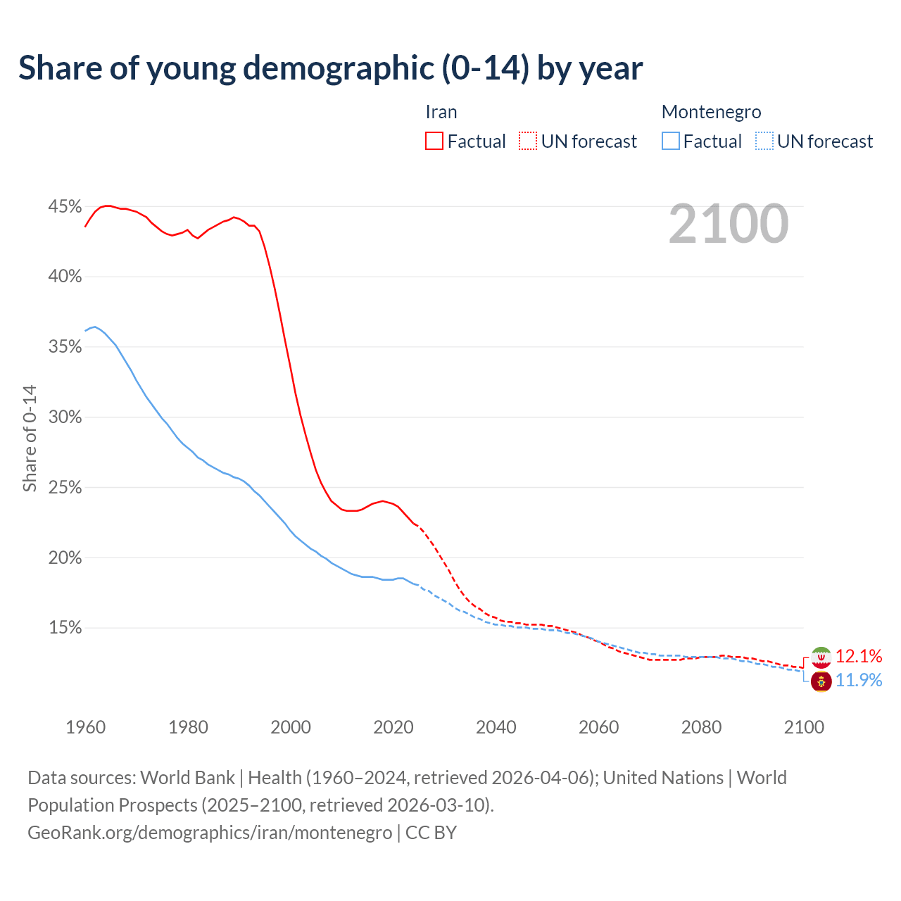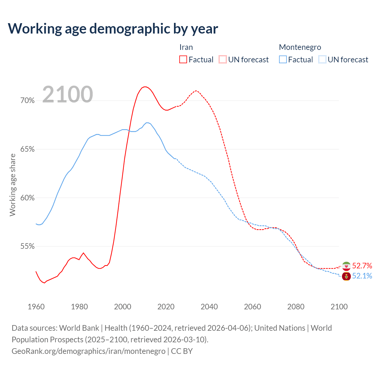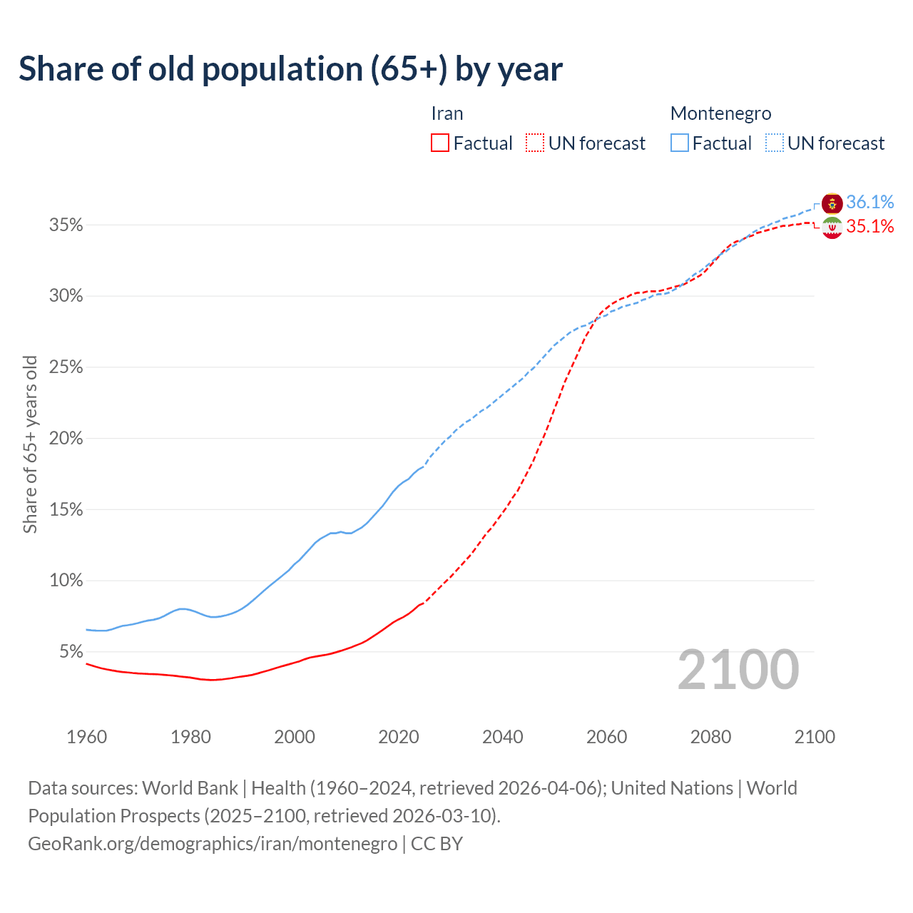 Median age Iran vs Montenegro, 1960-2100