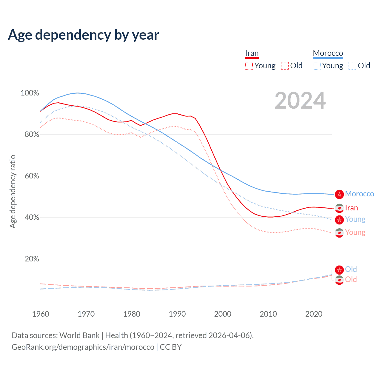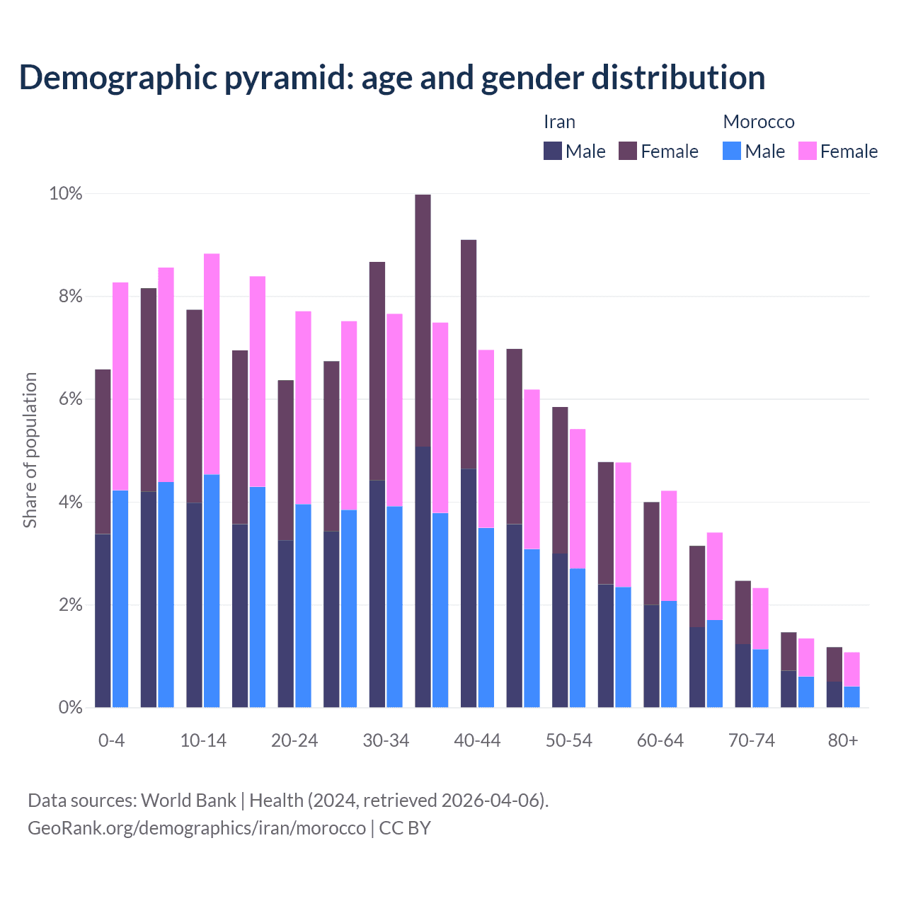 - Iran is ranked 79/196 by median age (oldest to youngest) vs 100/196 for Morocco.
