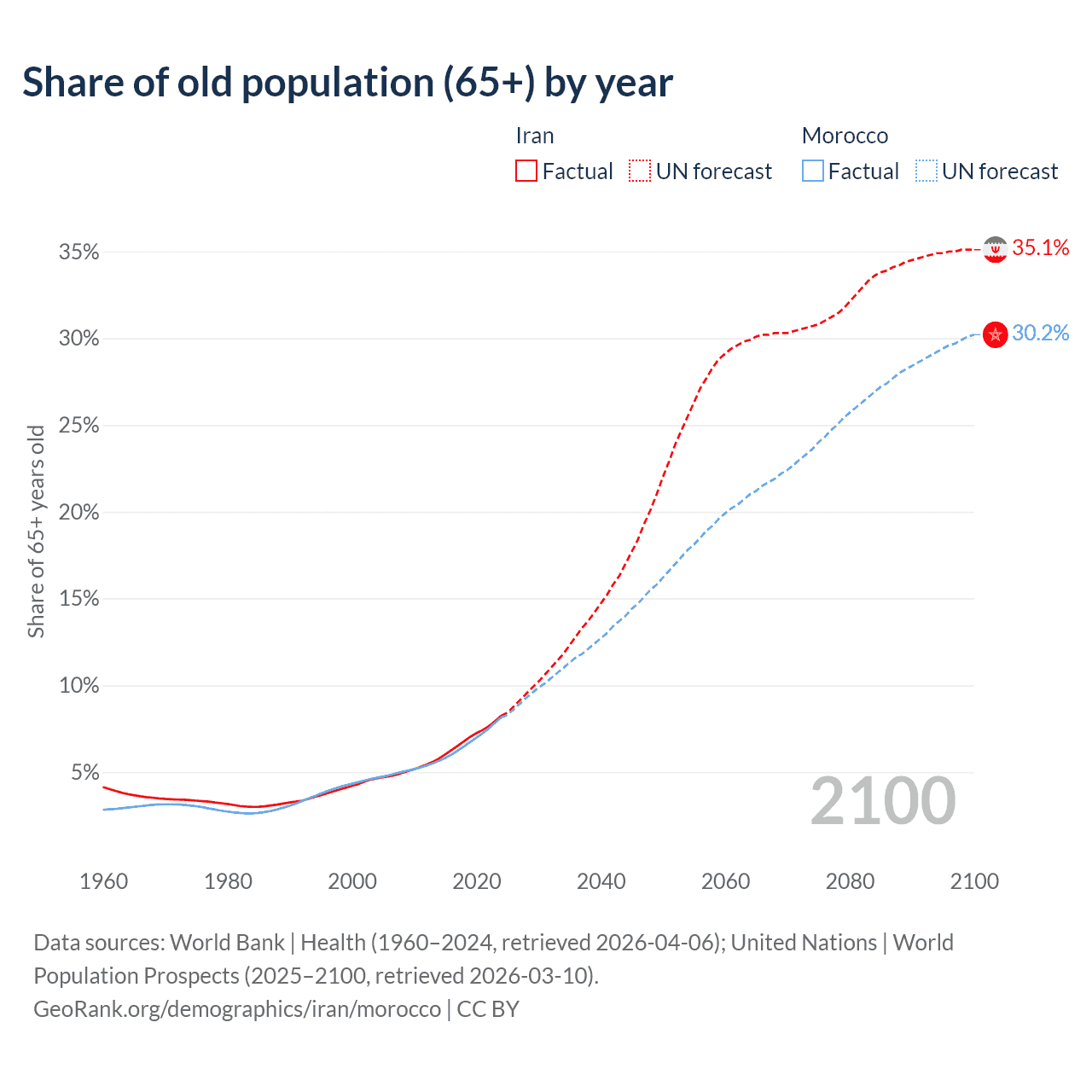 - The share of old-age demographic (65+) in Iran is 8.24% vs 8.14% in Morocco.