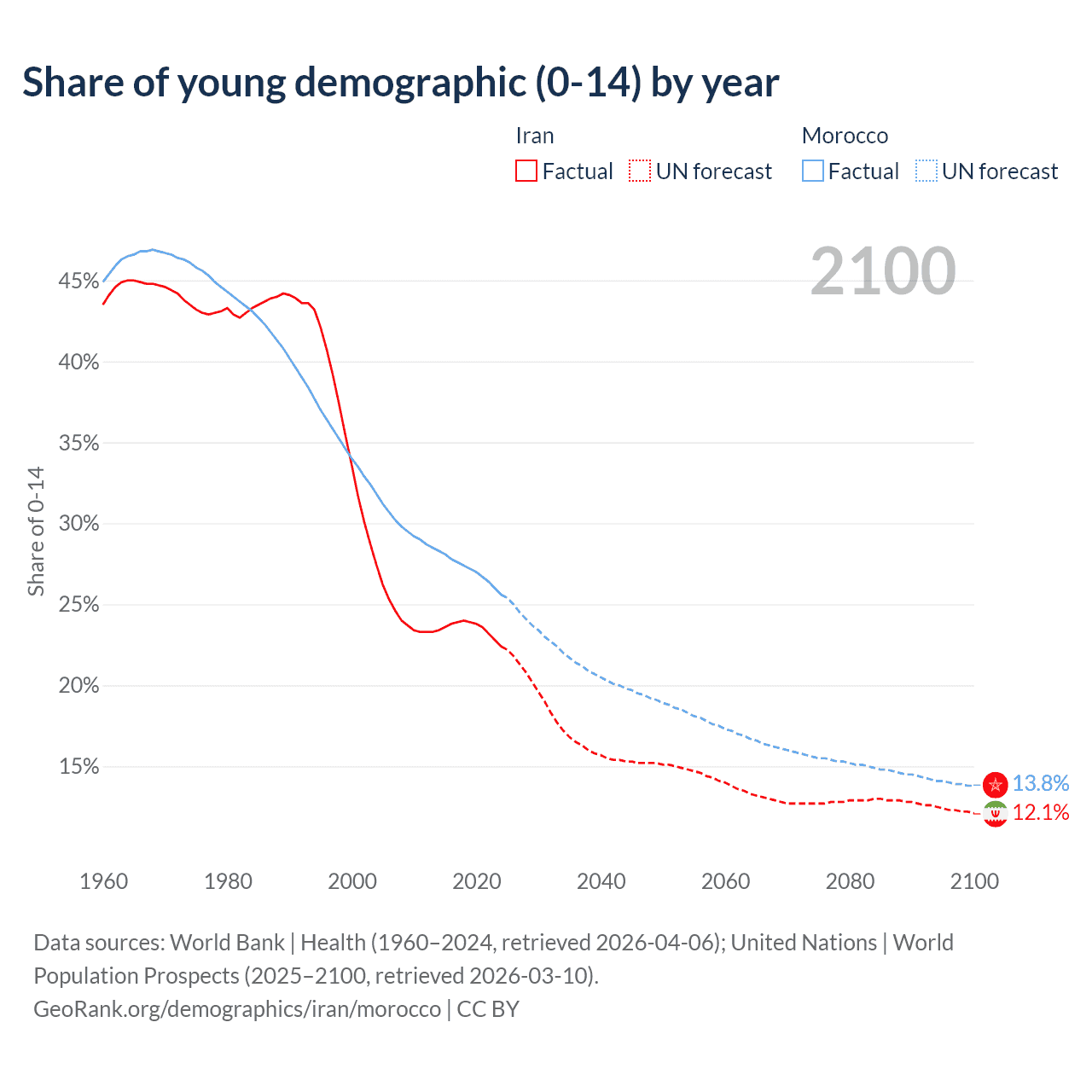 - The share of young demographic (0-15 years old) in Iran is 22.4% vs 25.6% in Morocco.