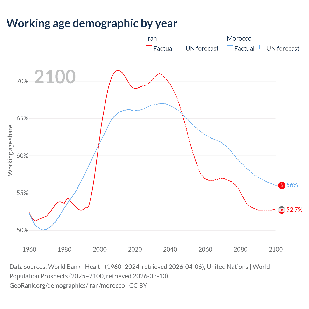 - Iran has 64.8M working age adults (aged 15-64) vs 25.7M in Morocco.