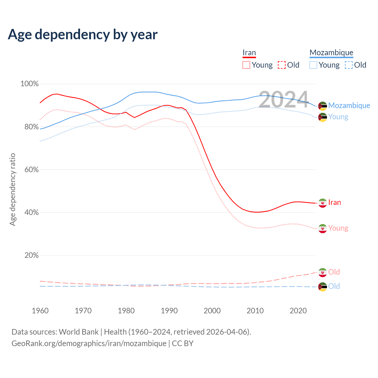 - Iran is ranked 79/196 by median age (oldest to youngest) vs 189/196 for Mozambique.