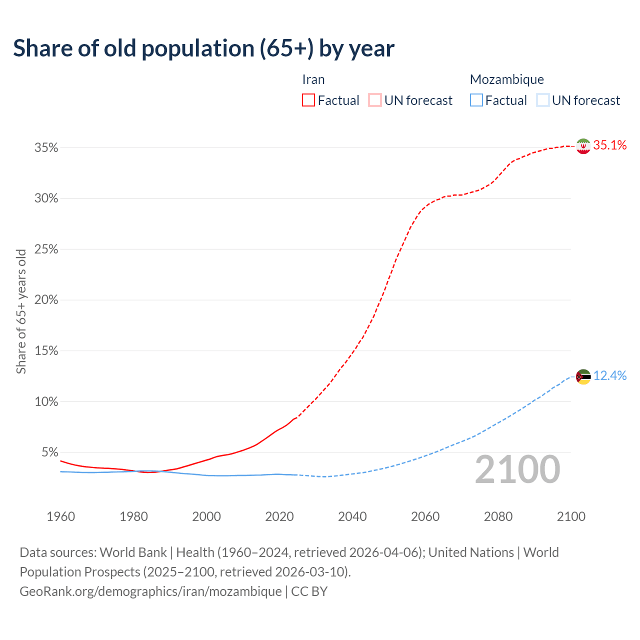 - The share of old-age demographic (65+) in Iran is 8.24% vs 2.75% in Mozambique.