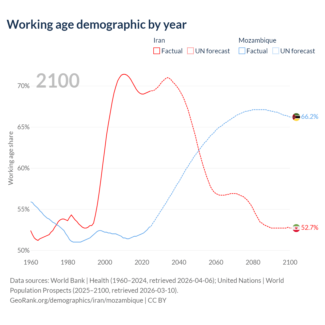 - Iran has 64.8M working age adults (aged 15-64) vs 19.5M in Mozambique.