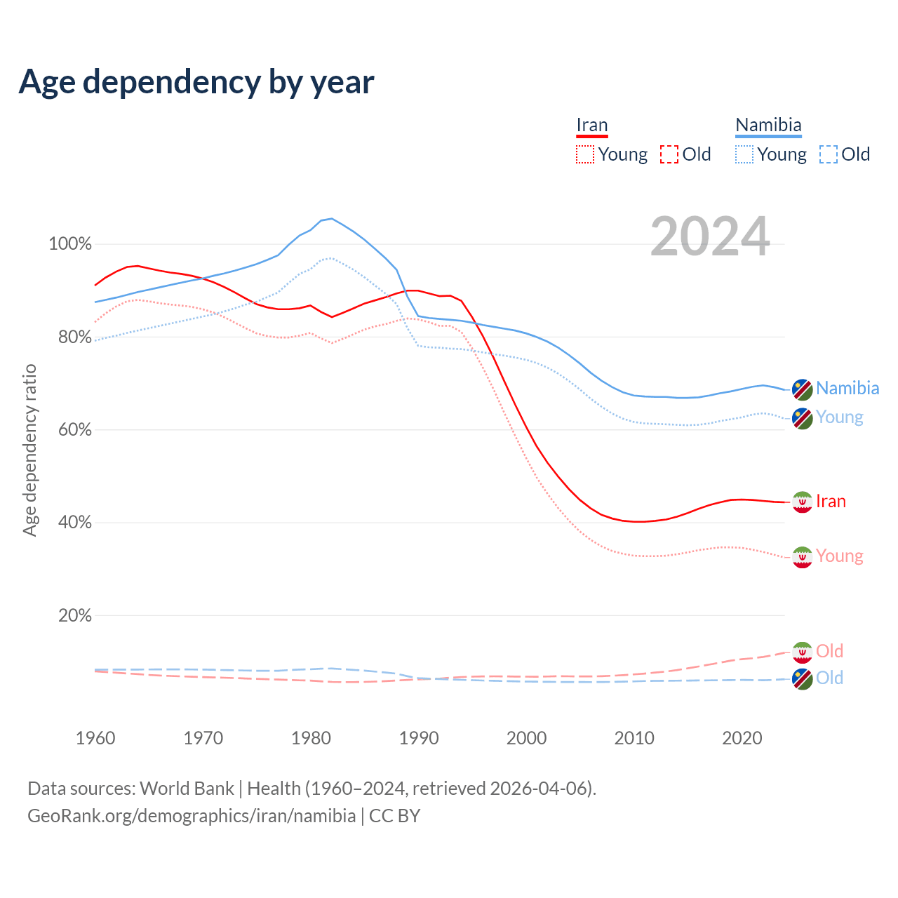 - The share of old-age demographic (65+) in Iran is 8.24% vs 3.67% in Namibia.