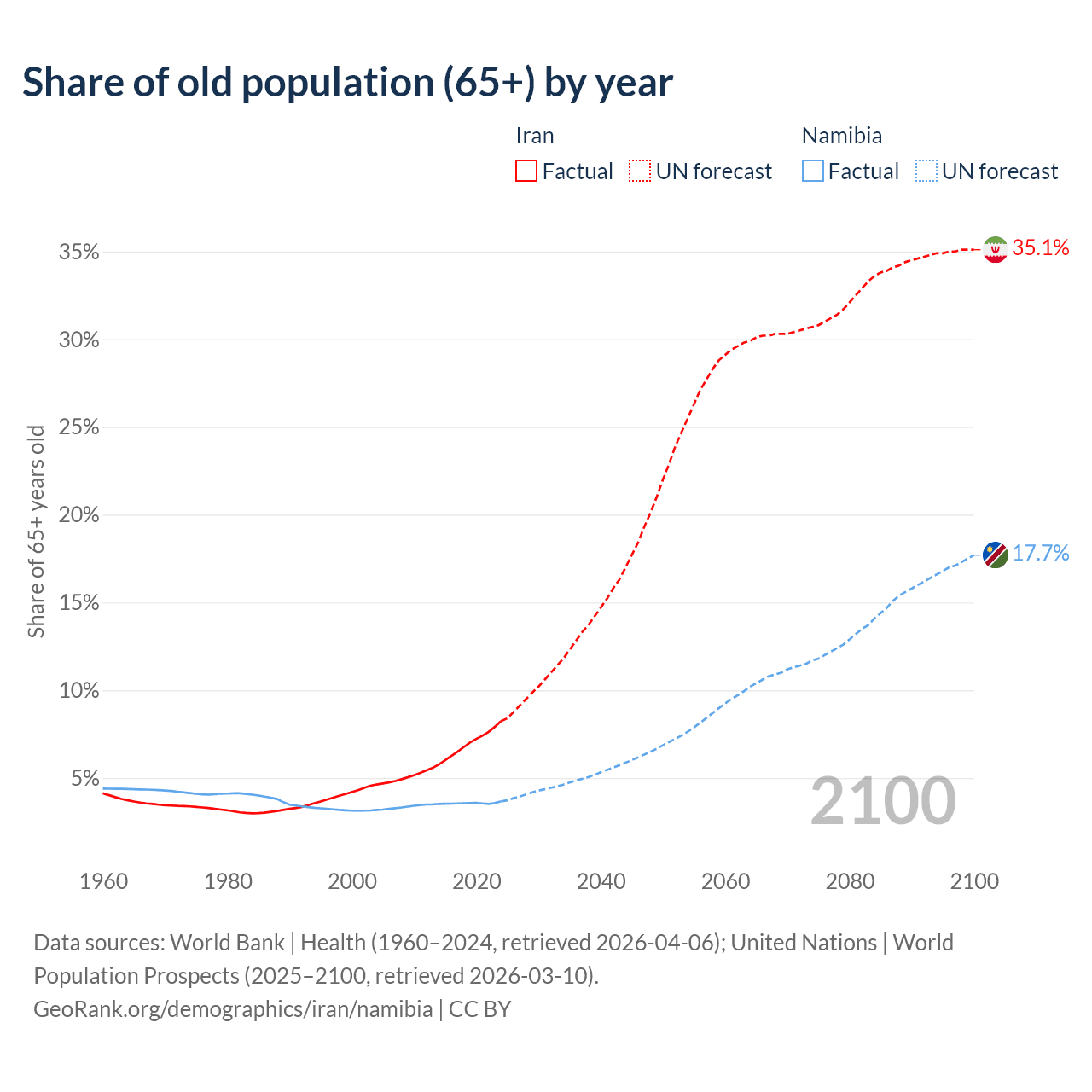 The share of older people aged 65 and over is 8.24% in Iran and 3.67% in Namibia. Life expectancy in Iran compared to Namibia .