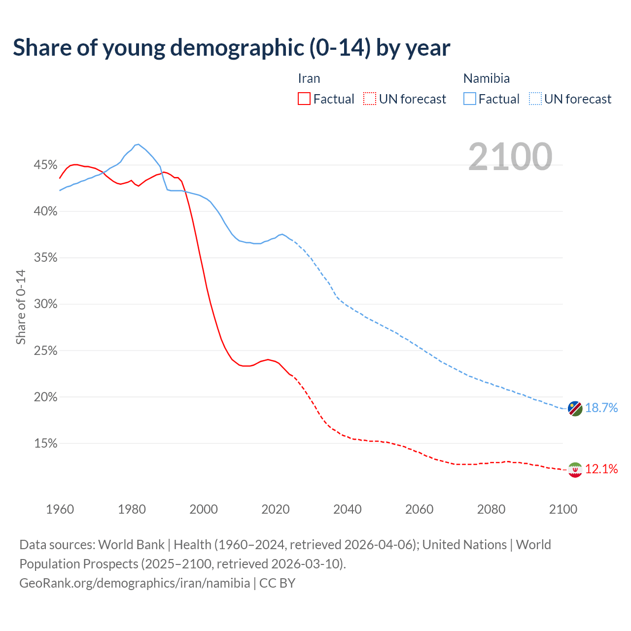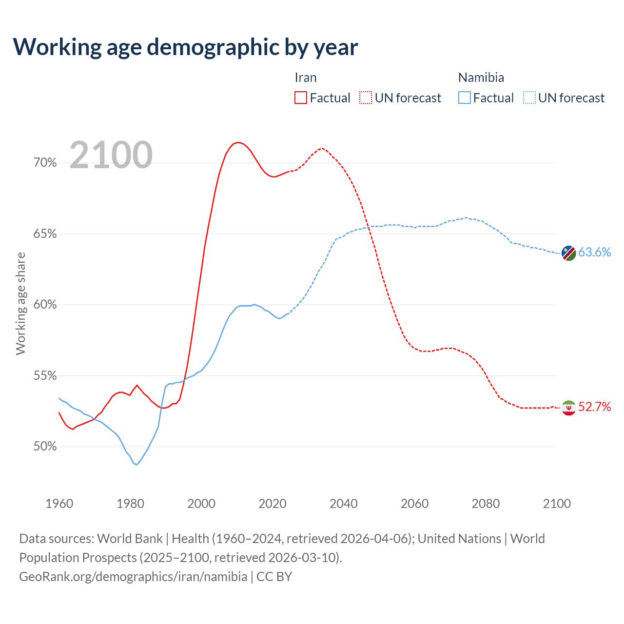 Median age Iran vs Namibia, 1960-2100
