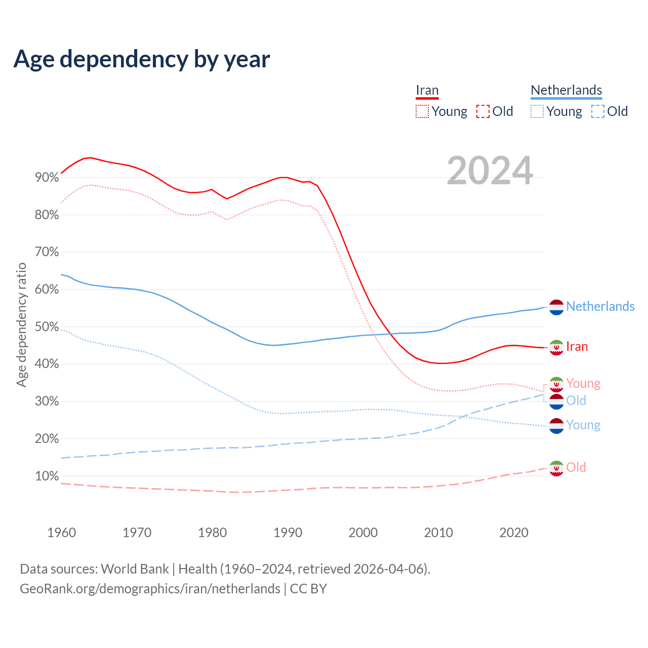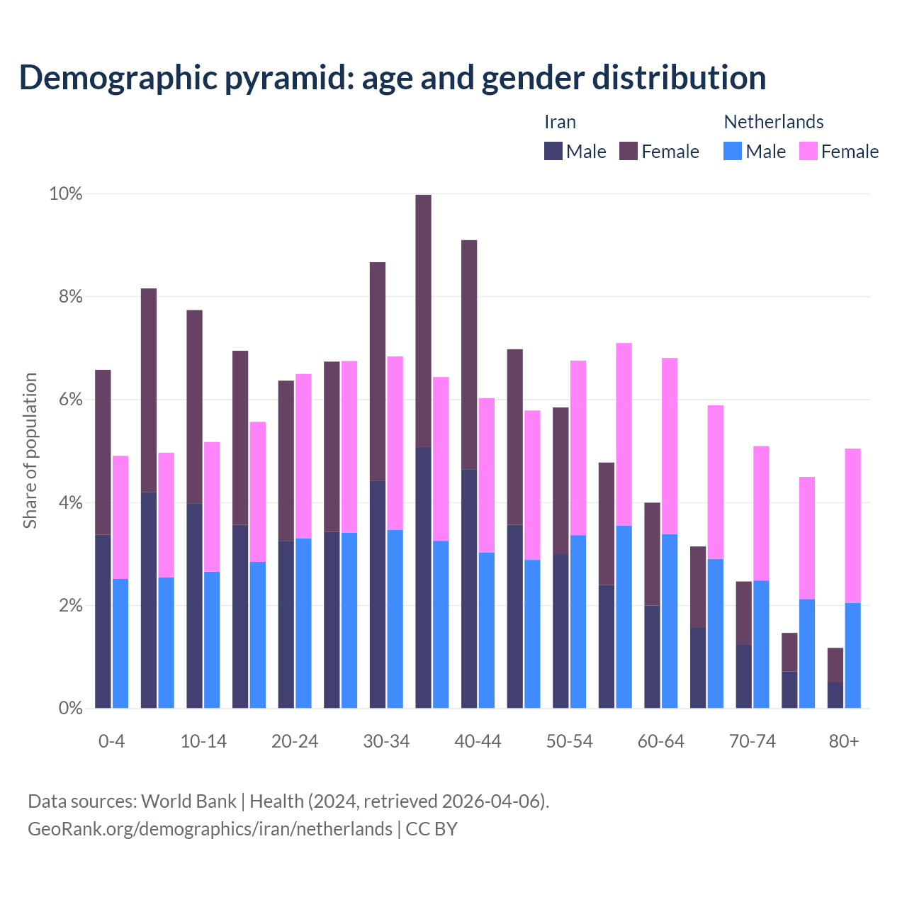 - Iran is ranked 79/196 by median age (oldest to youngest) vs 33/196 for the Netherlands.