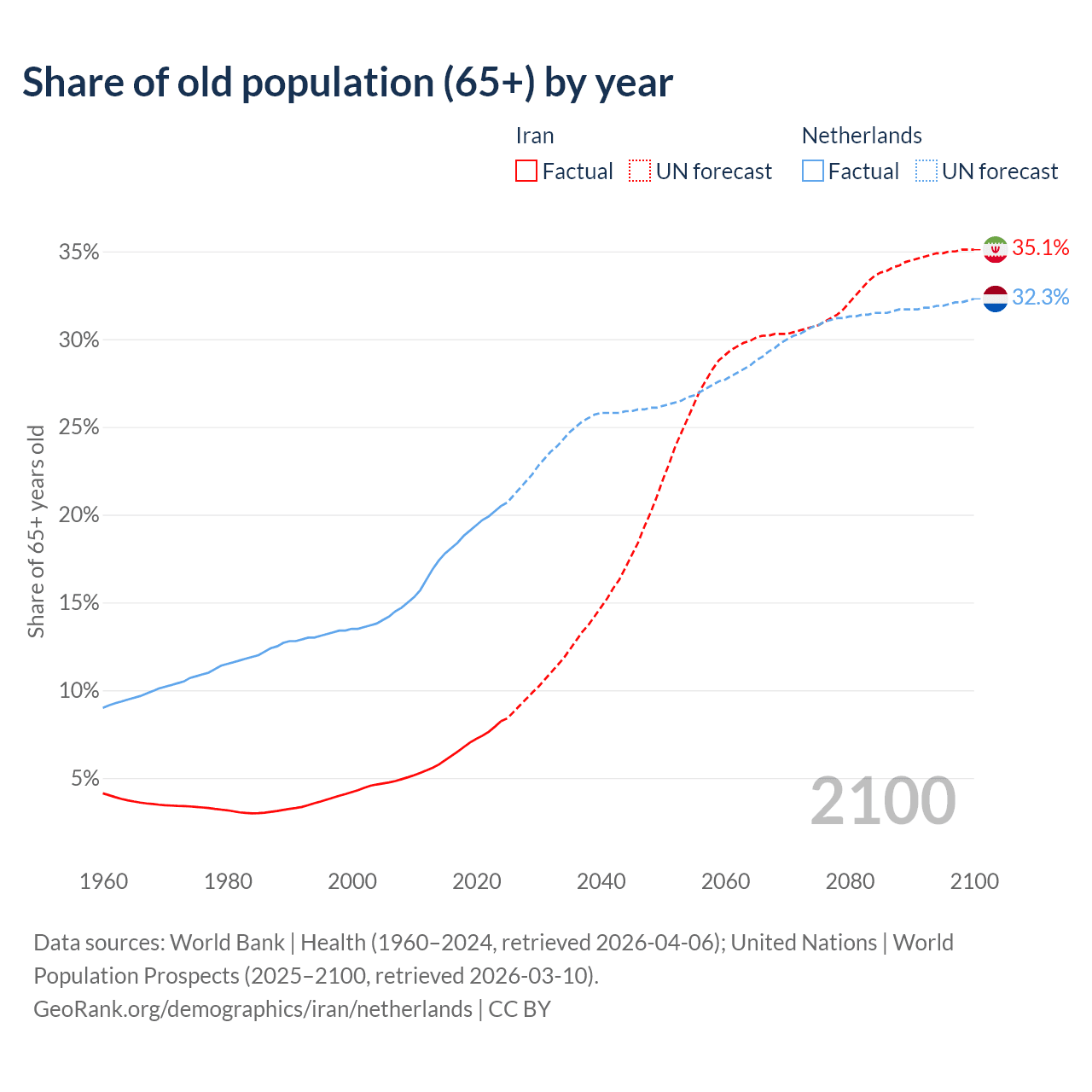 - The share of old-age demographic (65+) in Iran is 8.24% vs 20.5% in the Netherlands.