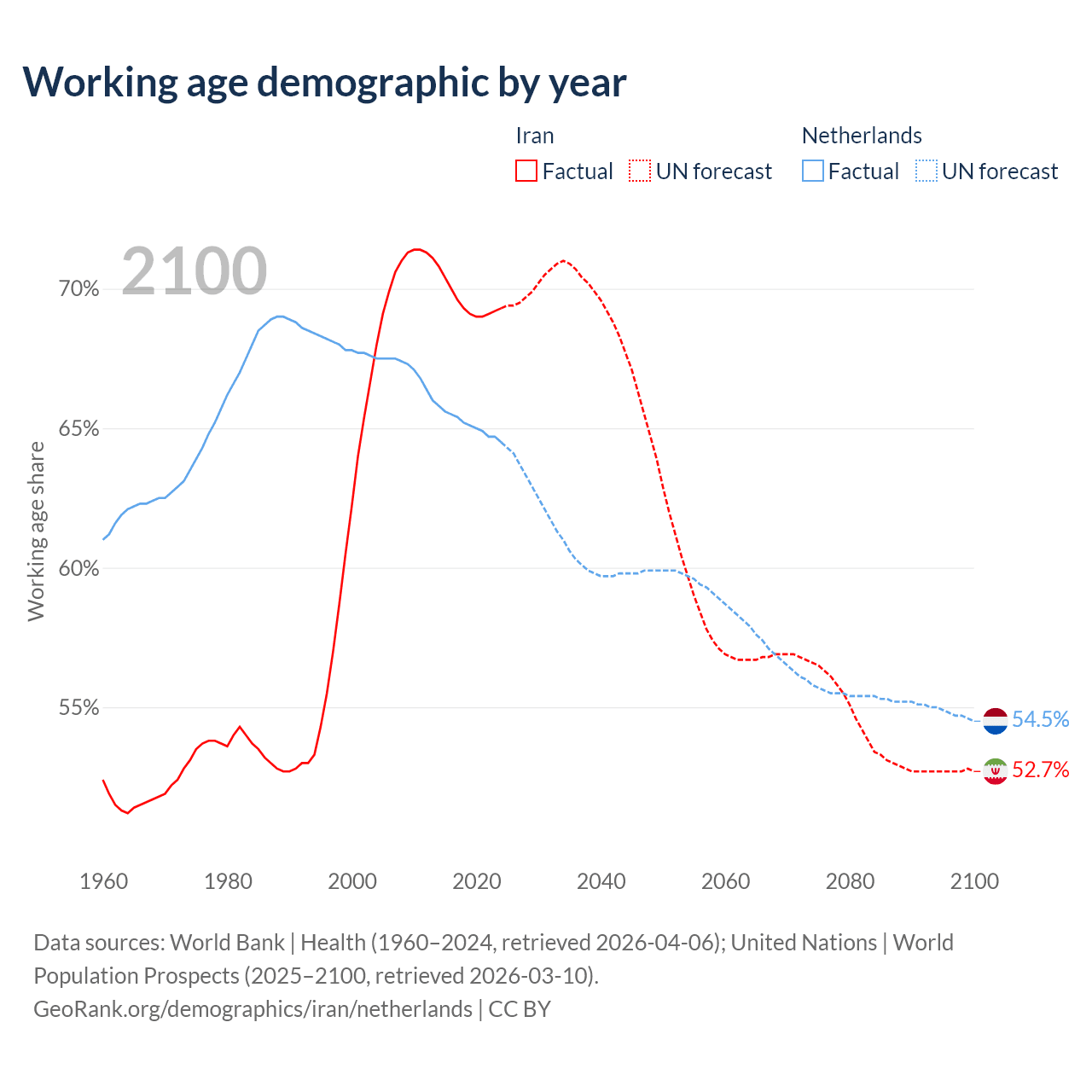 - Iran has 64.8M working age adults (aged 15-64) vs 11.8M in the Netherlands.