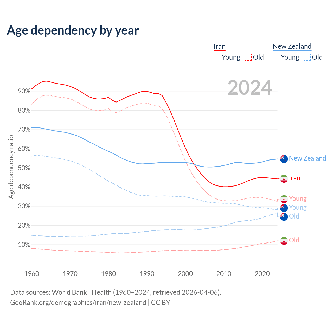 - The share of old-age demographic (65+) in Iran is 8.24% vs 17.2% in New Zealand.