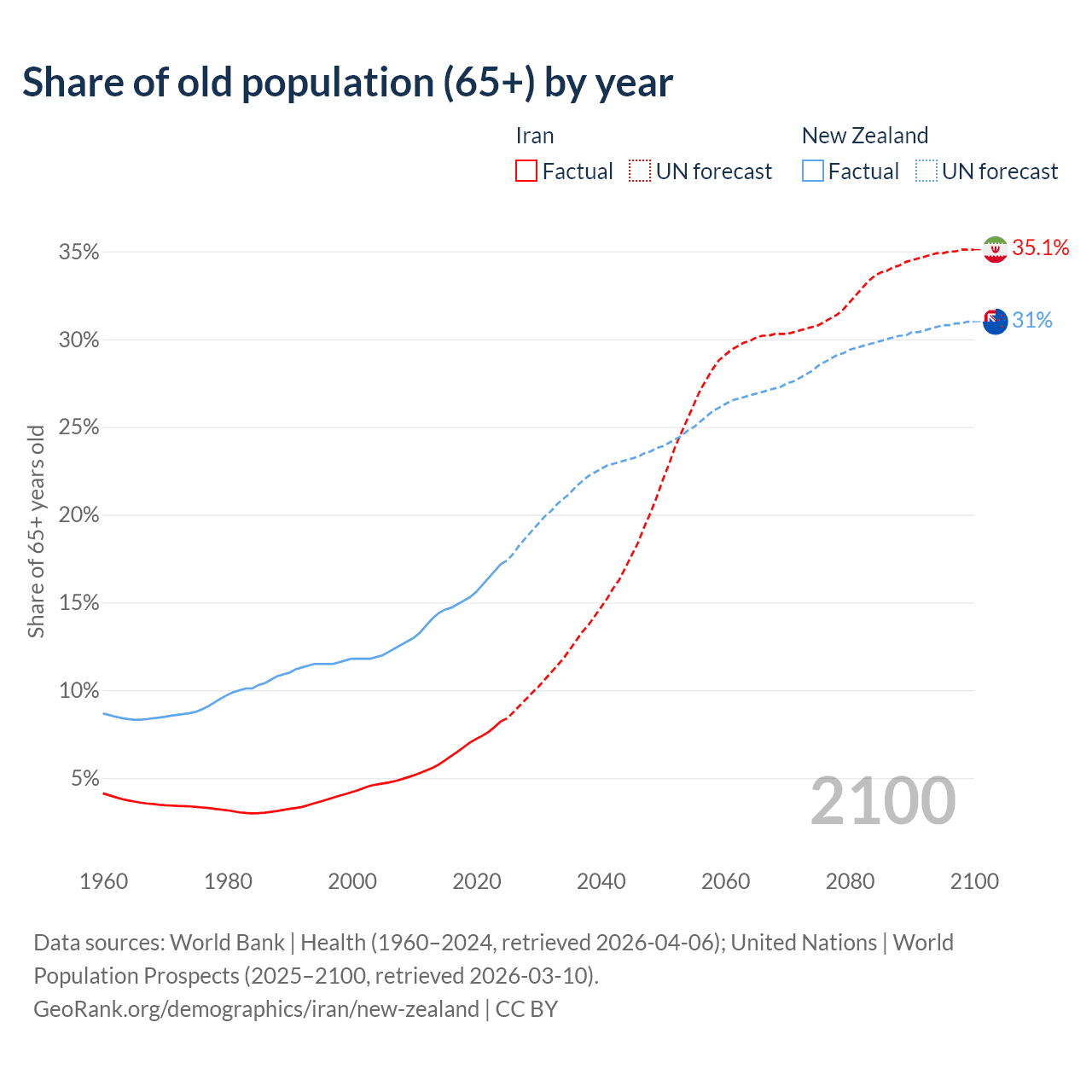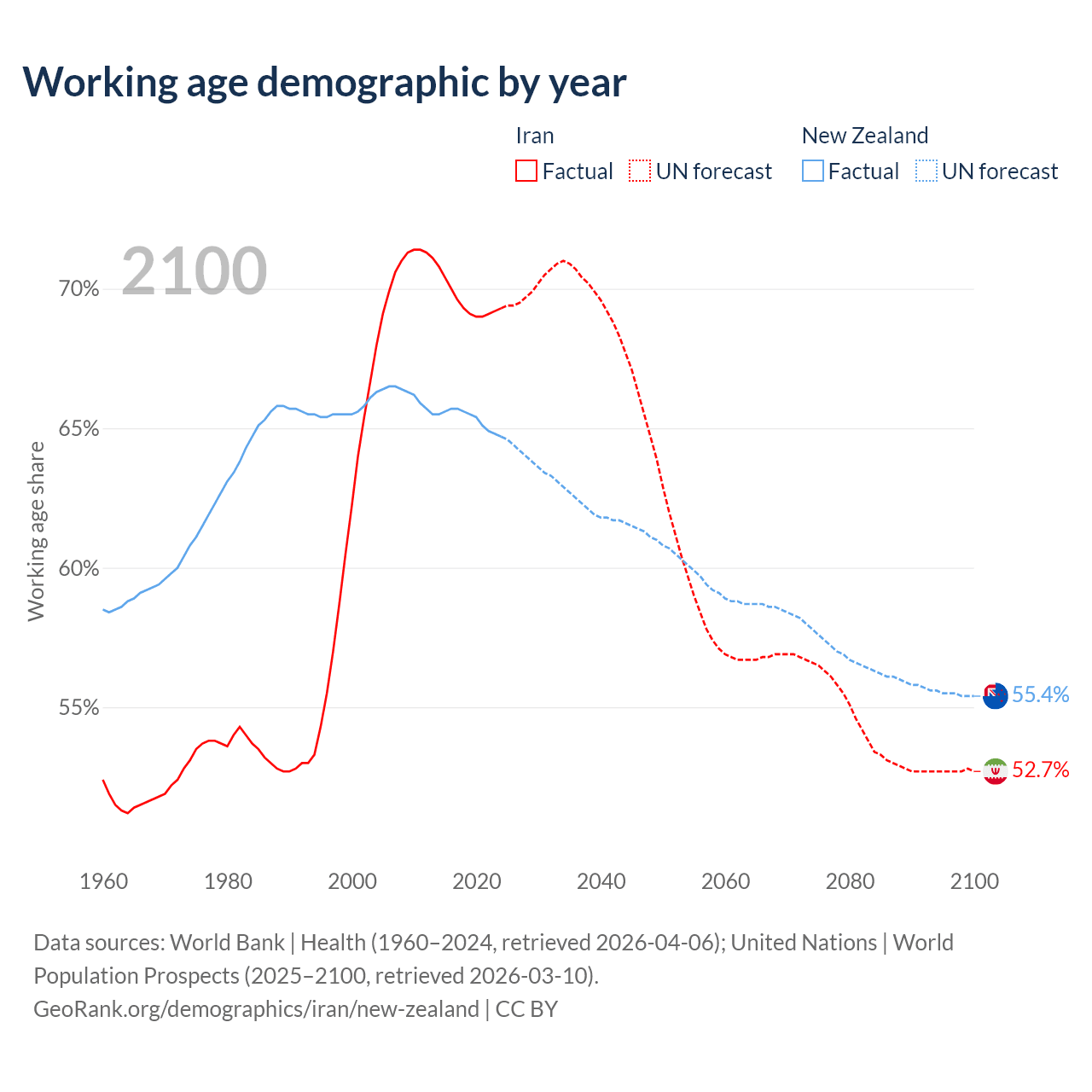 Median age Iran vs New Zealand, 1960-2100
