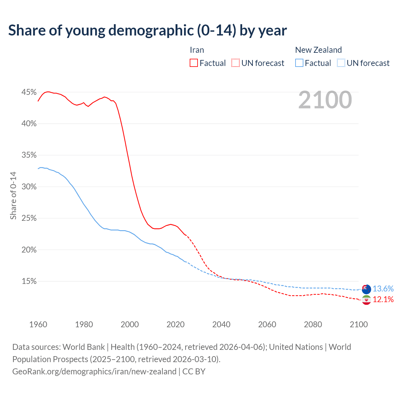 - The share of young demographic (0-15 years old) in Iran is 22.4% vs 18.1% in New Zealand.