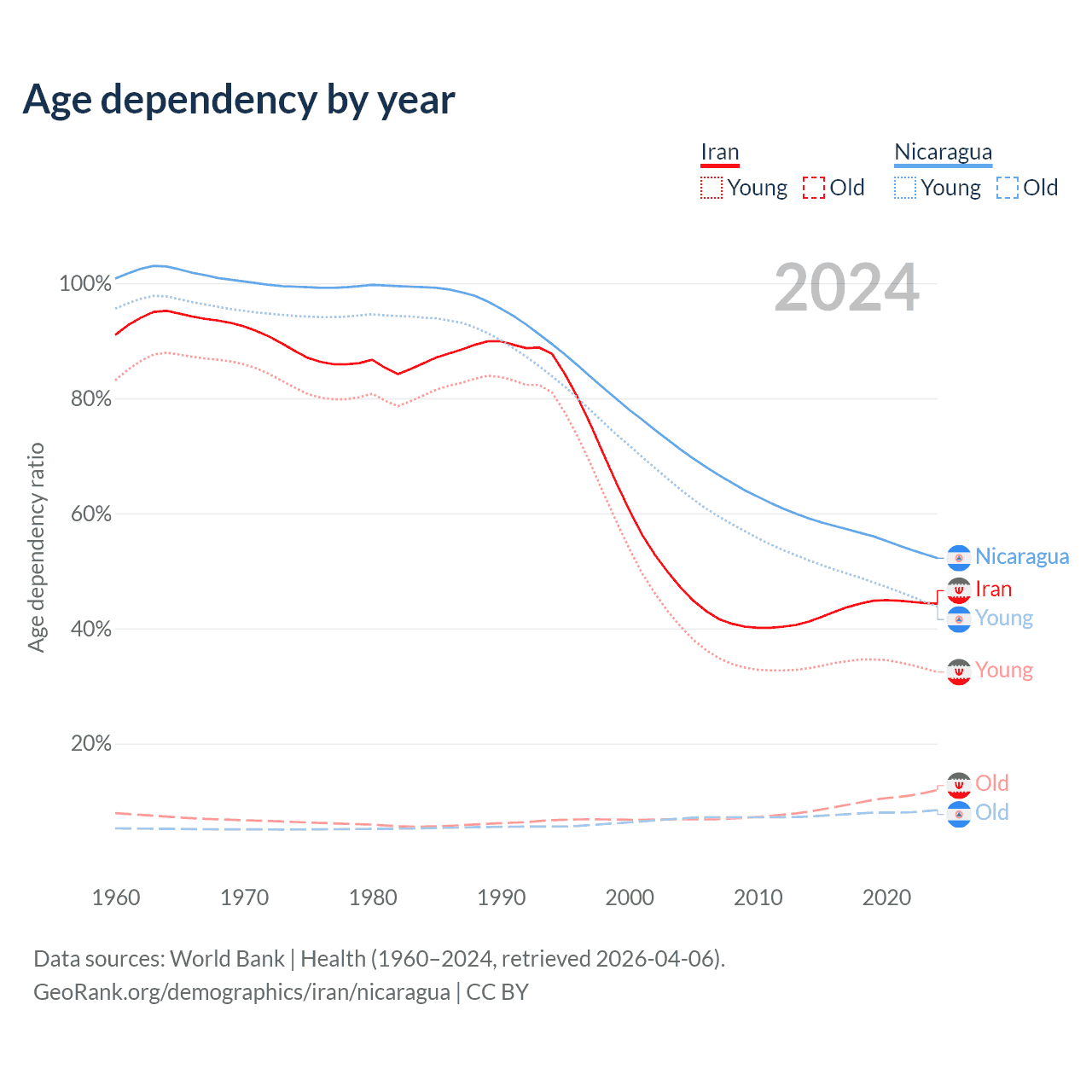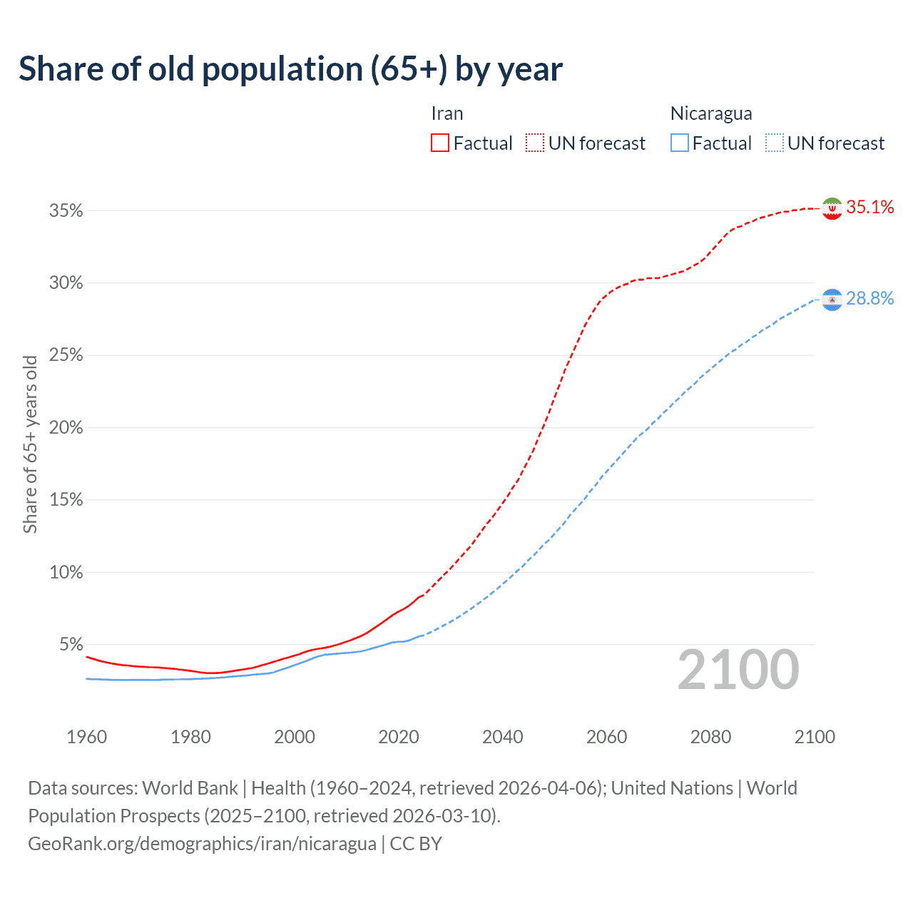 - The share of old-age demographic (65+) in Iran is 8.24% vs 5.53% in Nicaragua.