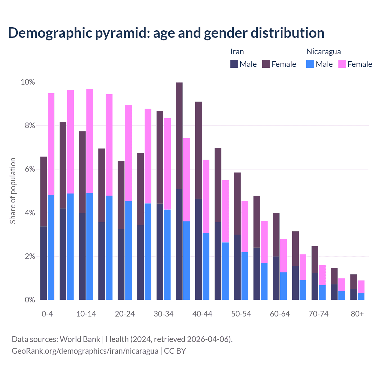 - The median age in Iran is 34.3 years compared to 26.6 years in Nicaragua.