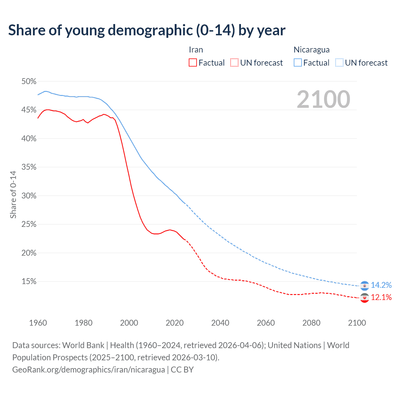 - The share of young demographic (0-15 years old) in Iran is 22.4% vs 28.8% in Nicaragua.