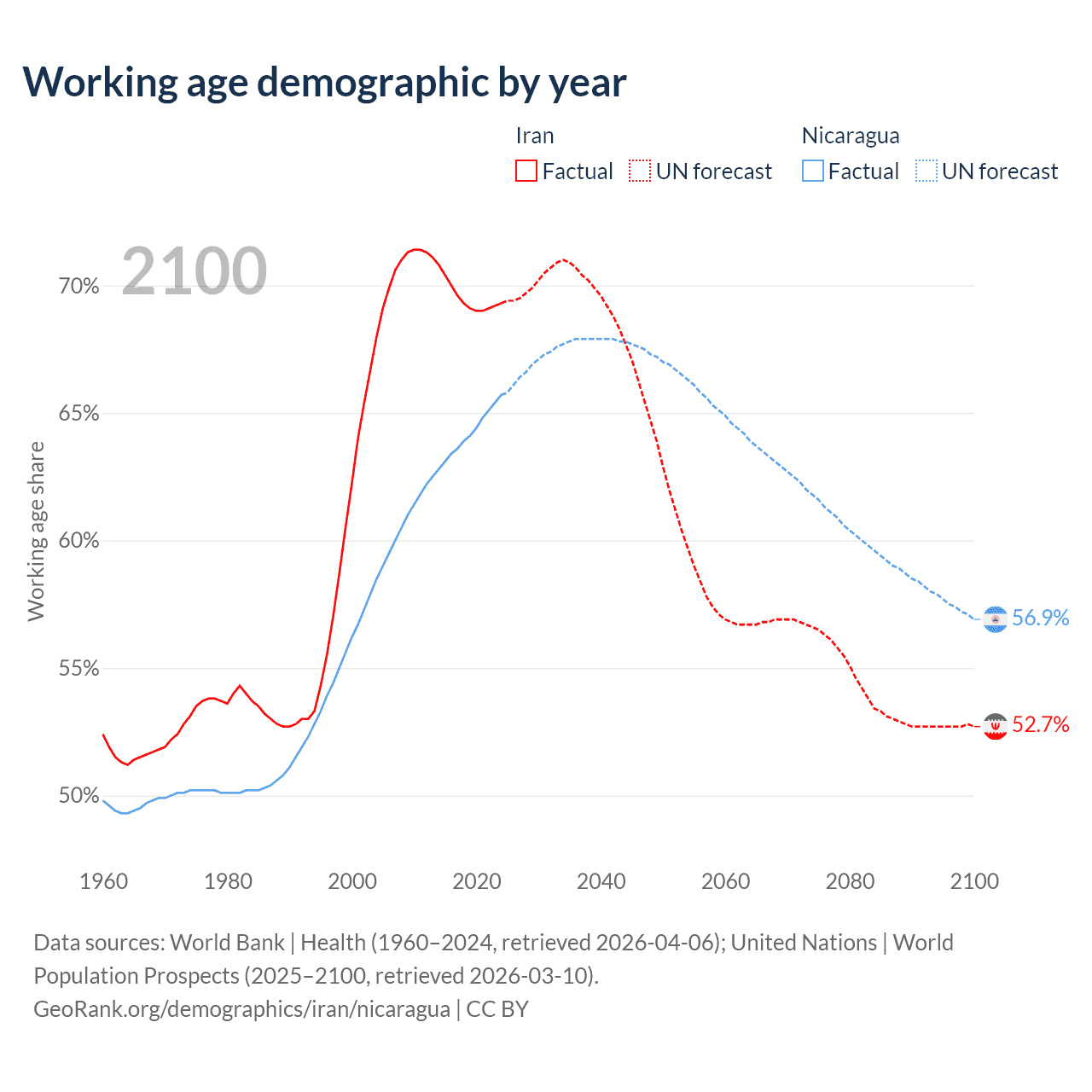 - Iran has 64.8M working age adults (aged 15-64) vs 4.68M in Nicaragua.
