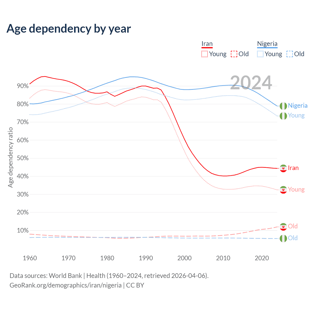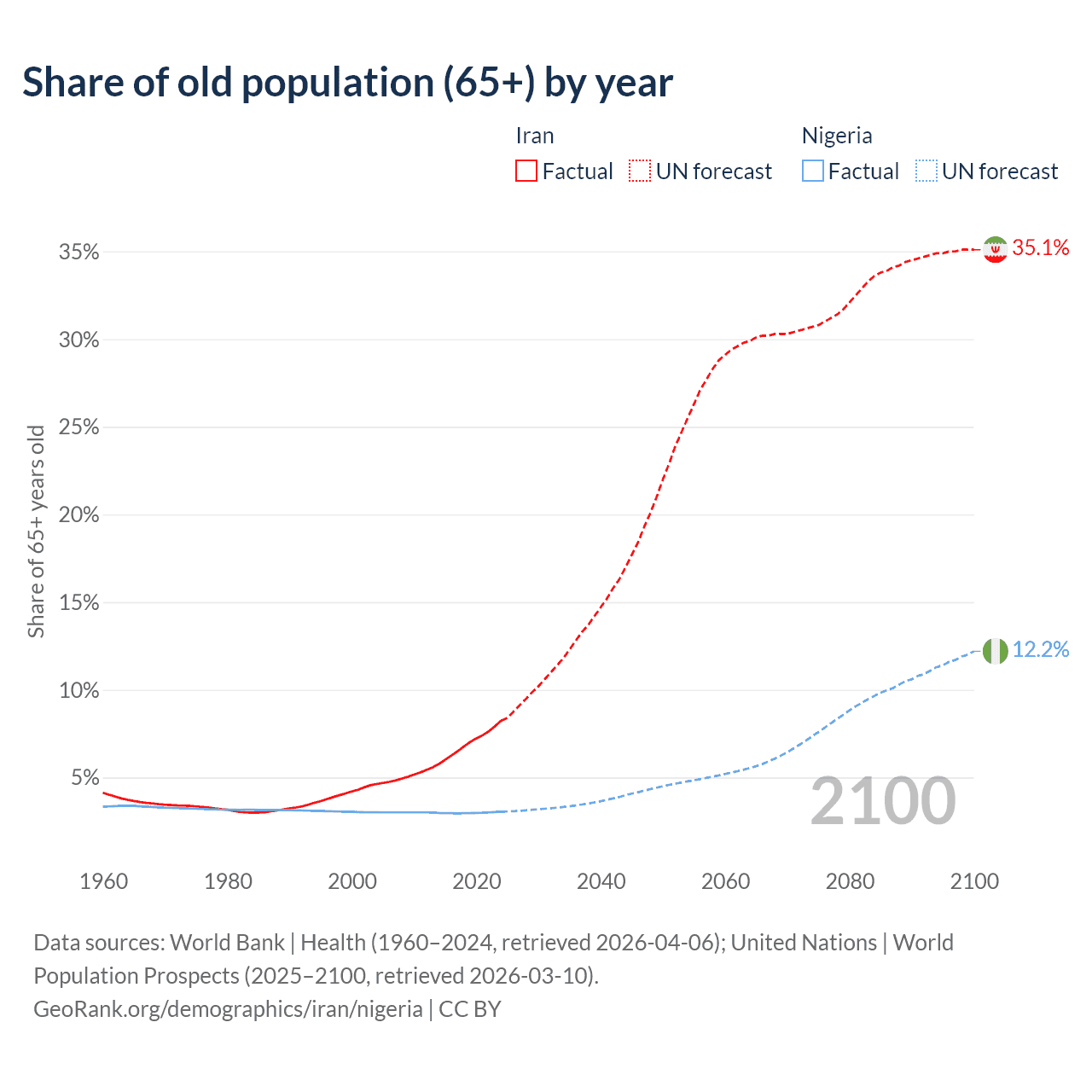 - The share of old-age demographic (65+) in Iran is 8.24% vs 3.05% in Nigeria.
