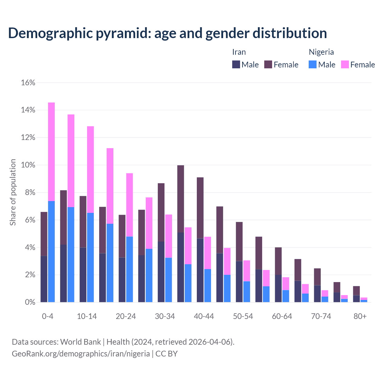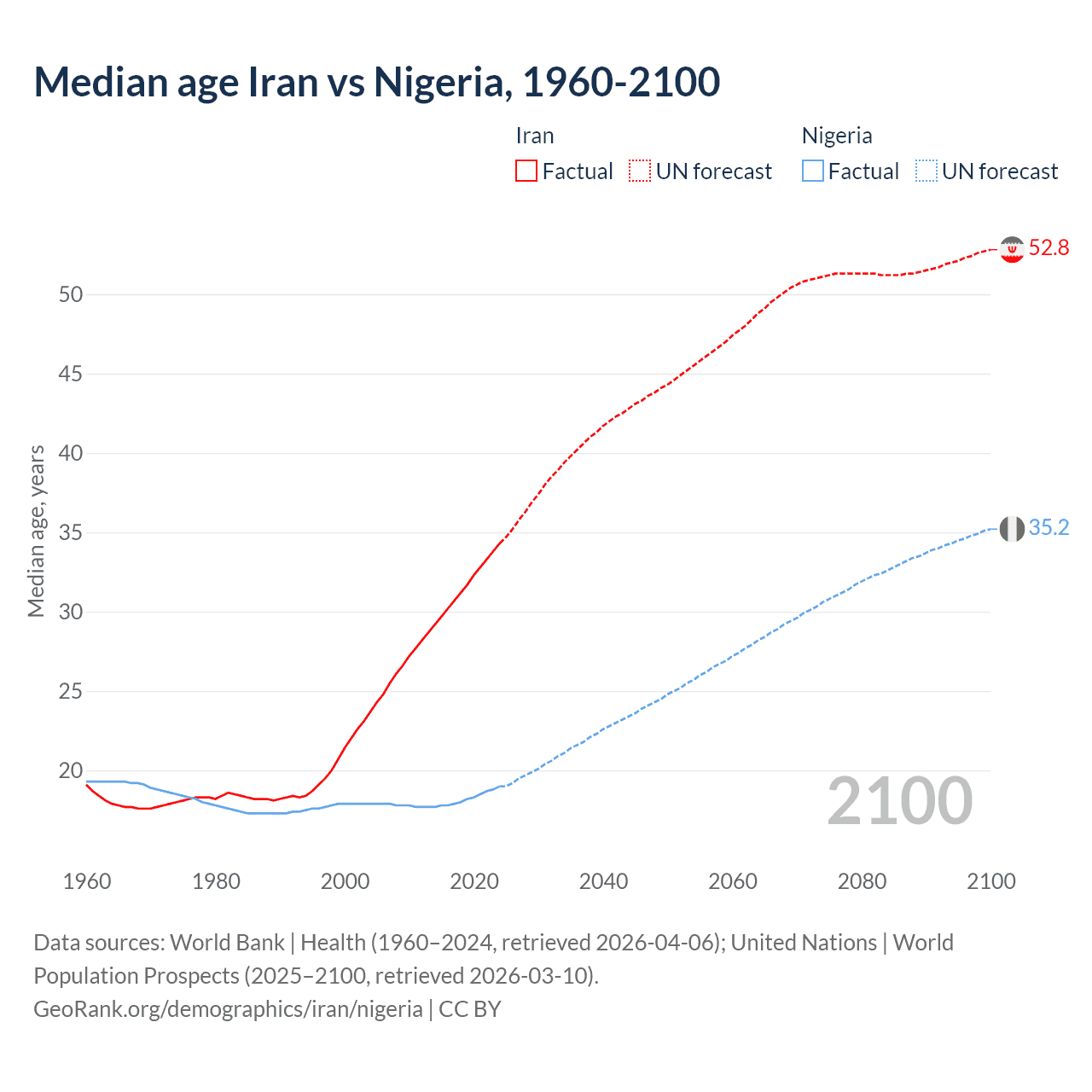- Iran is ranked 79/196 by median age (oldest to youngest) vs 178/196 for Nigeria.