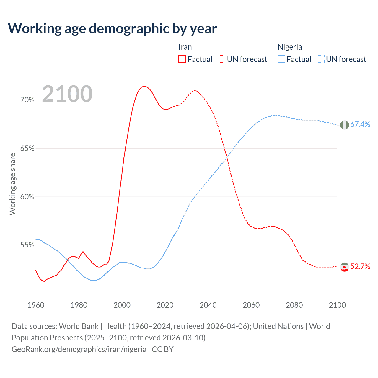 - Iran has 64.8M working age adults (aged 15-64) vs 136M in Nigeria.
