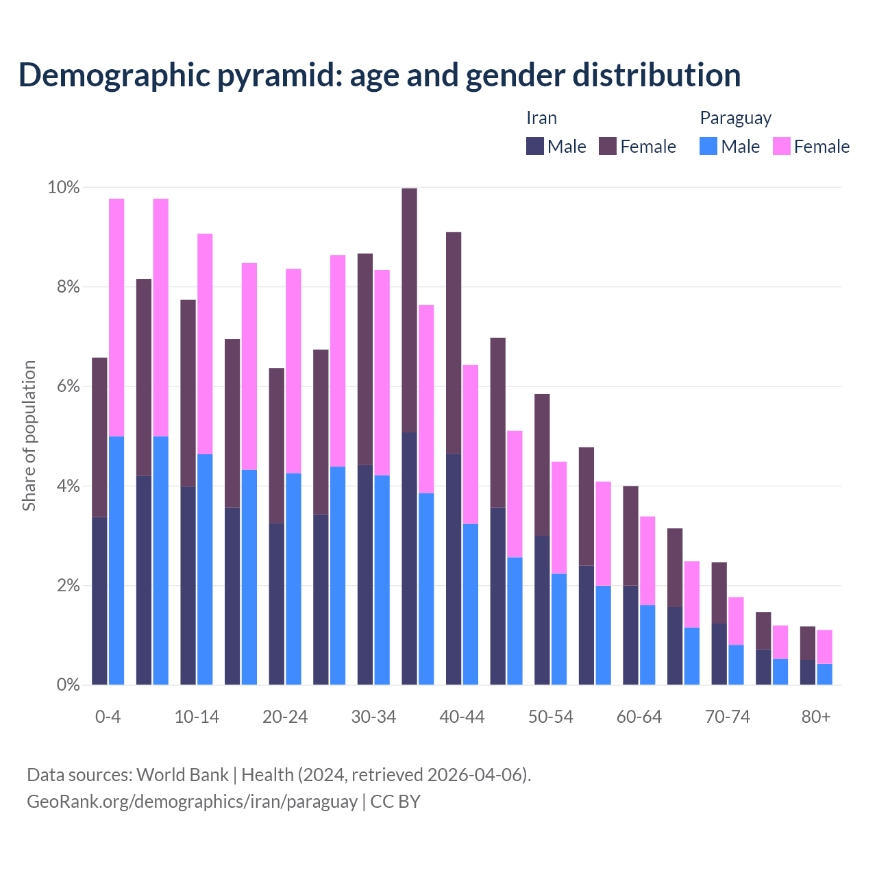 - Iran is ranked 79/196 by median age (oldest to youngest) vs 118/196 for Paraguay.