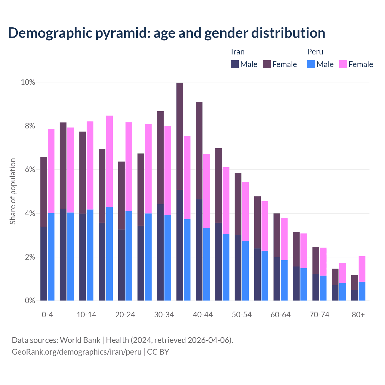 - Iran is ranked 79/196 by median age (oldest to youngest) vs 97/196 for Peru.