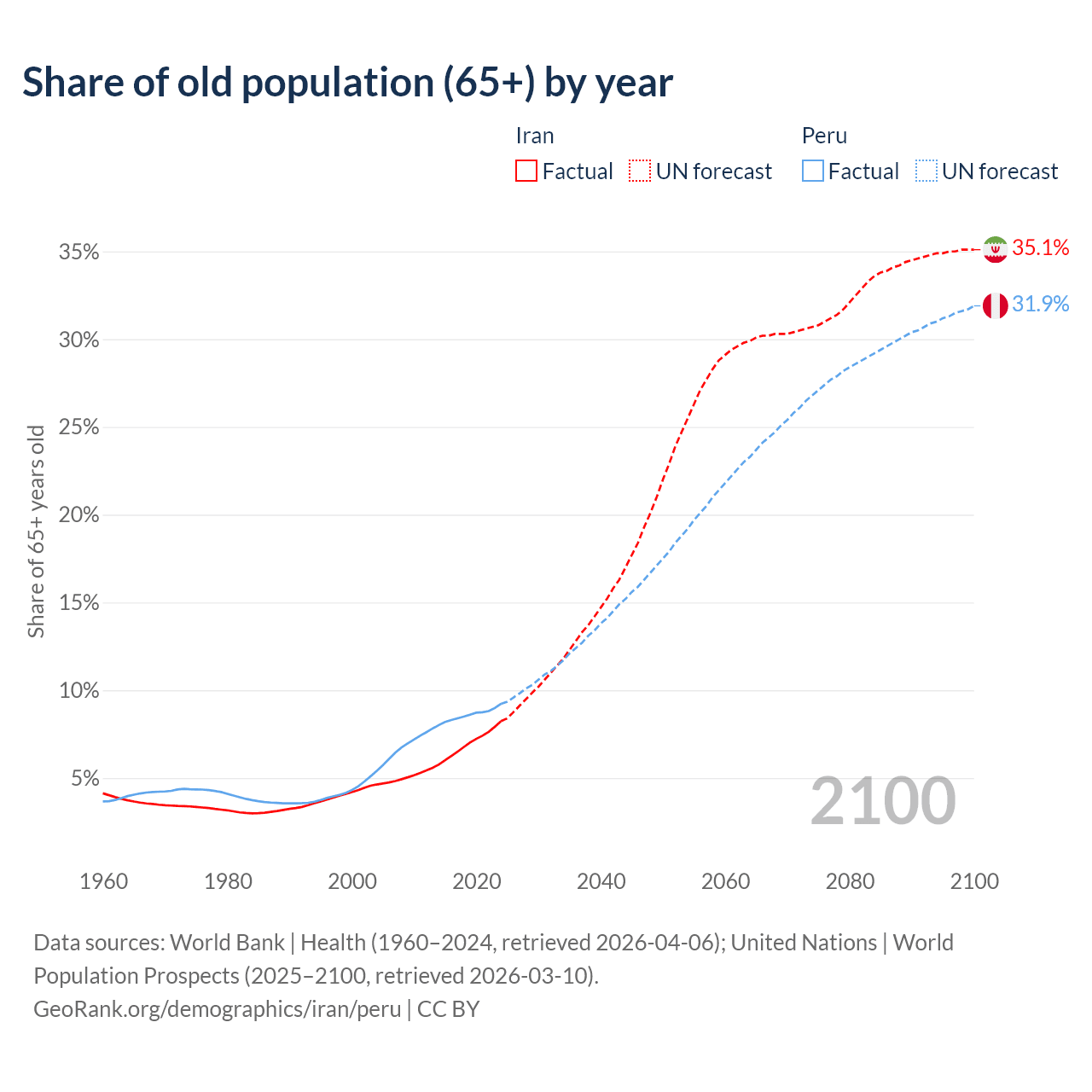 - The share of old-age demographic (65+) in Iran is 8.24% vs 9.23% in Peru.